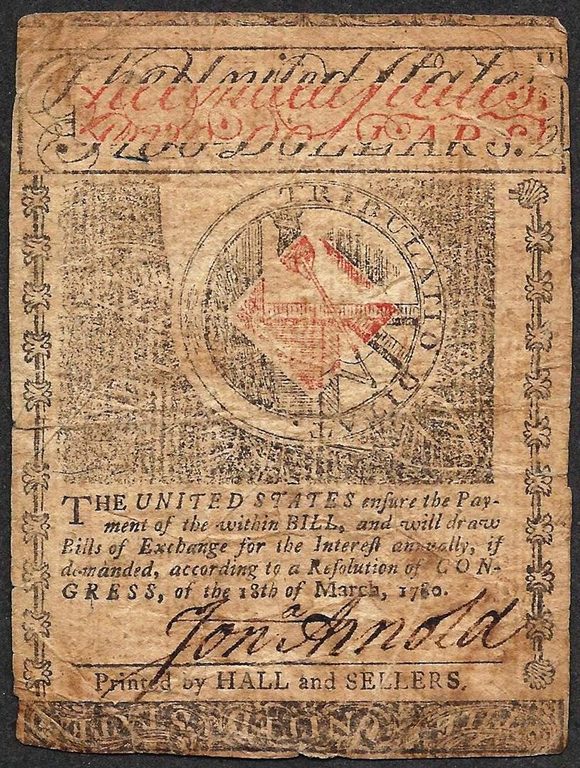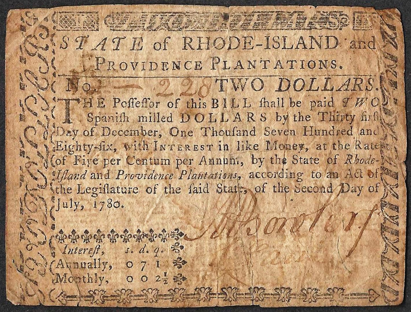 One July 2, 1780 $2 Rhode Island Colonial Currency Note.