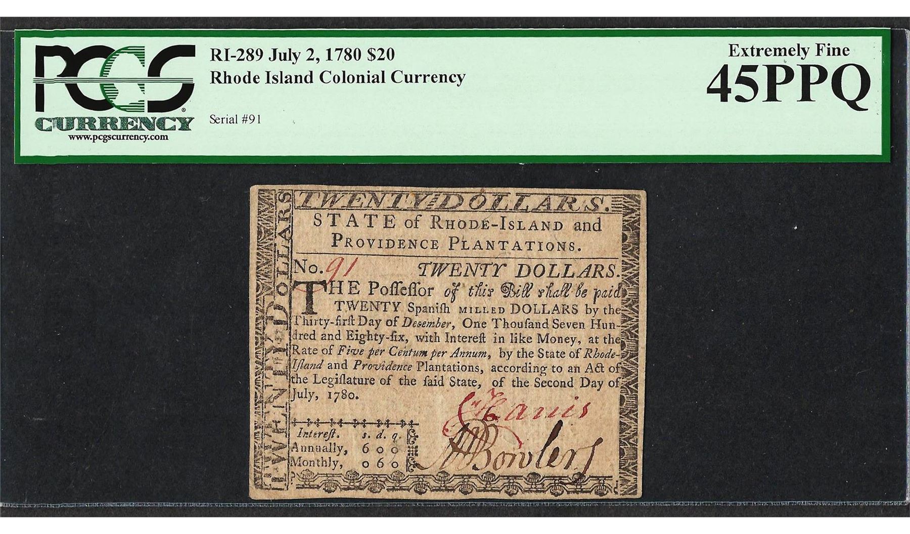 One July 2, 1780 $20 Rhode Island Colonial Currency Note RI-289 PCGS Extremely Fine 45PPQ. PCGS Graded.