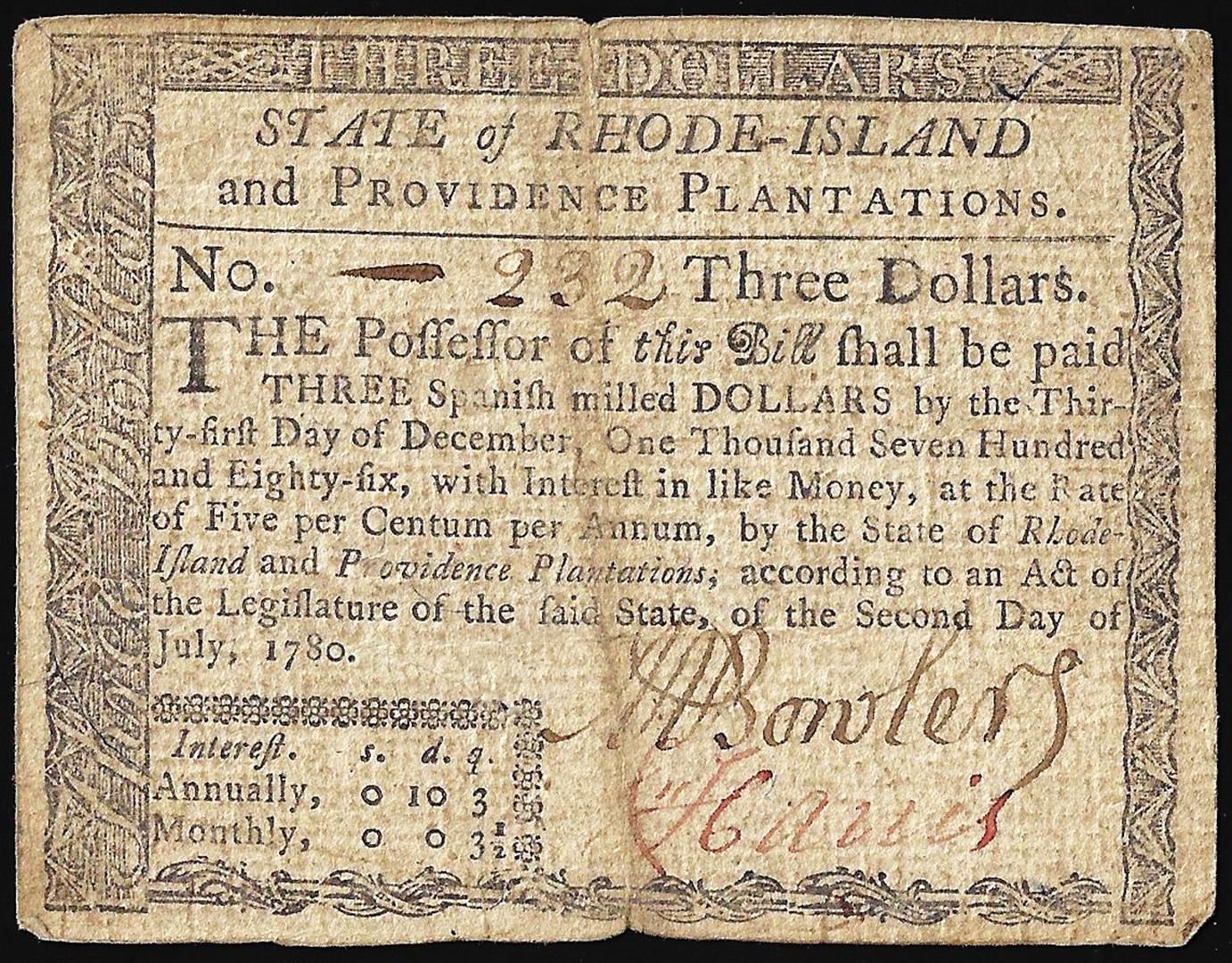 One July 2, 1780 $3 Rhode Island Colonial Currency Note.
