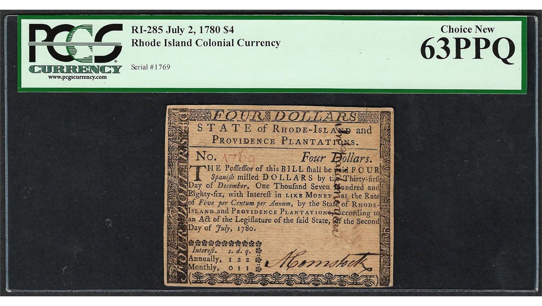 July 2, 1780 $4 Rhode Island Colonial Currency Note RI-285 PCGS Choice New 63PPQ