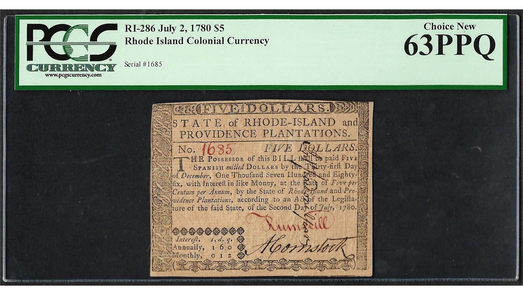 One July 2, 1780 $5 Rhode Island Colonial Currency Note RI-286 PCGS Choice New 63PPQ. PCGS Graded.