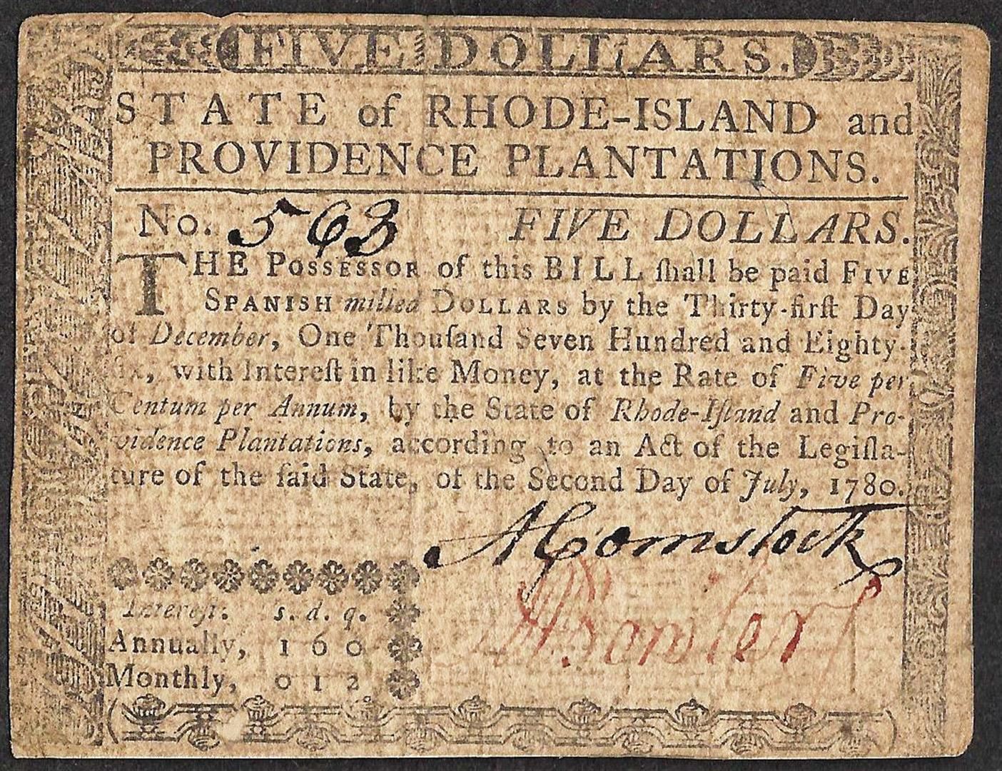 One July 2, 1780 $5 Rhode Island Colonial Currency Note.