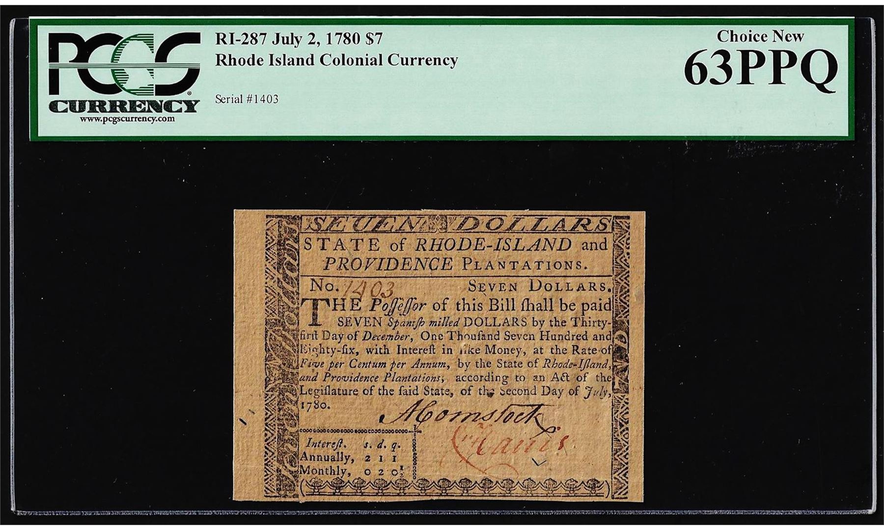 July 2, 1780 $7 Rhode Island Colonial Currency Note PCGS Choice New 63PPQ