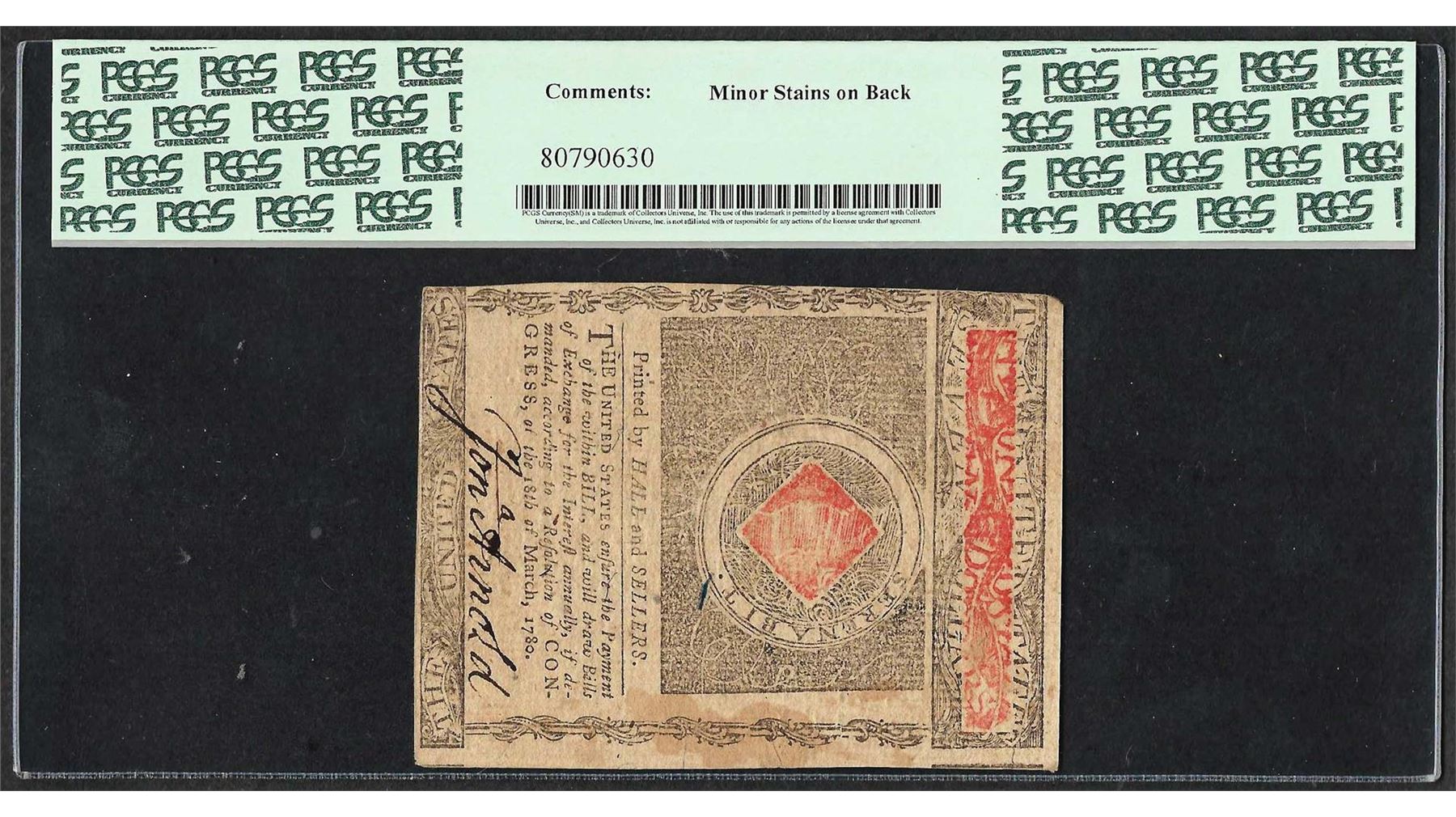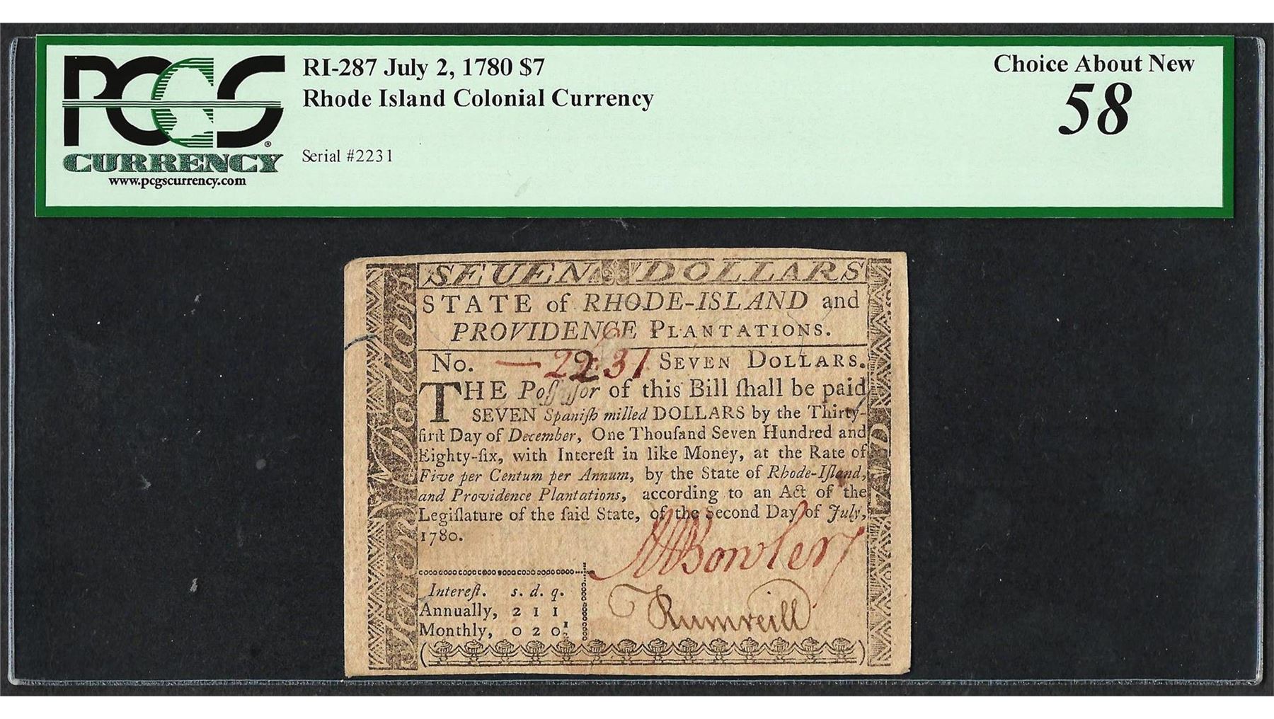One July 2, 1780 $7 Rhode Island Colonial Currency Note RI-287 PCGS Choice About New 58. PCGS Graded.