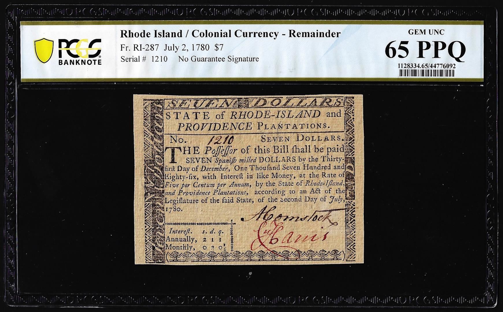 July 2, 1780 $7 Rhode Island Colonial Note Fr.RI-287 PCGS Gem Uncirculated 65PPQ