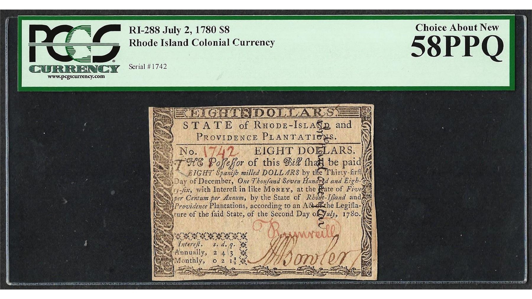 One July 2, 1780 $8 Rhode Island Colonial Currency Note PCGS Choice About New 58PPQ. PCGS Graded.