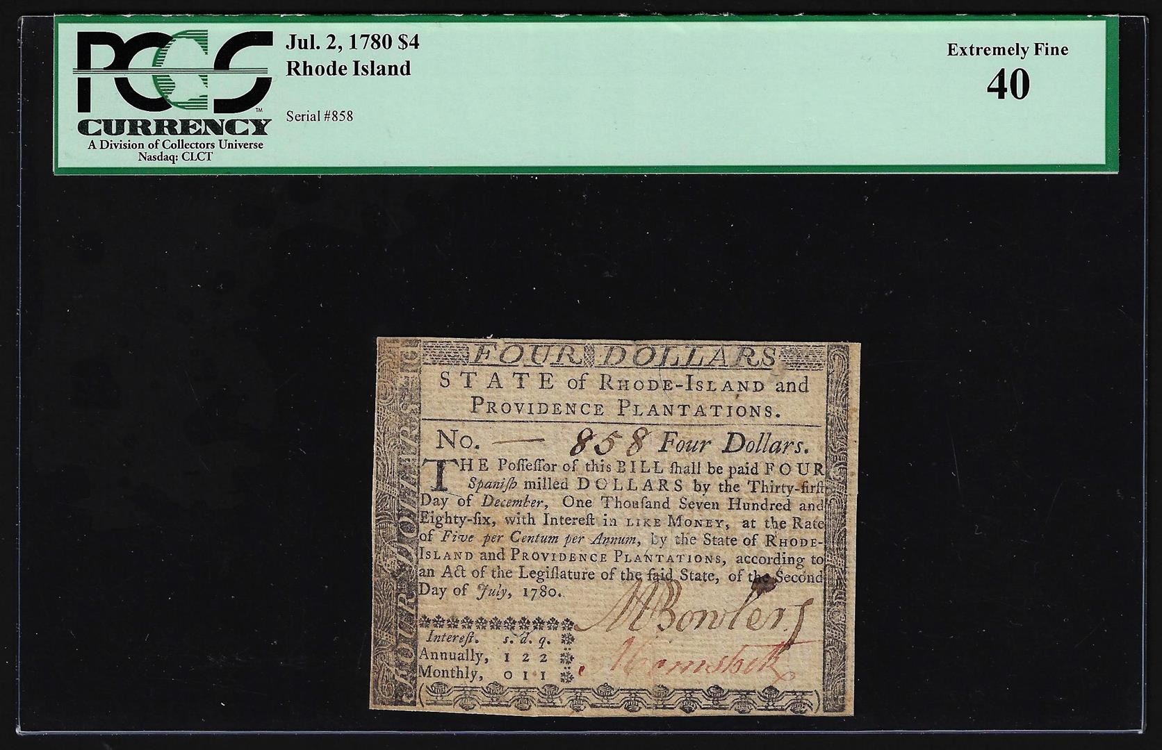 One July 2, 1780 Rhode Island $4 Colonial Currency Note PCGS Extremely Fine 40. PCGS Graded.