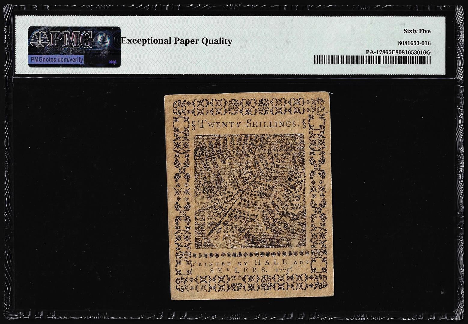 July 20, 1775 Pennsylvania 20 Shillings Colonial Currency Note PMG Gem Unc. 65EPQ