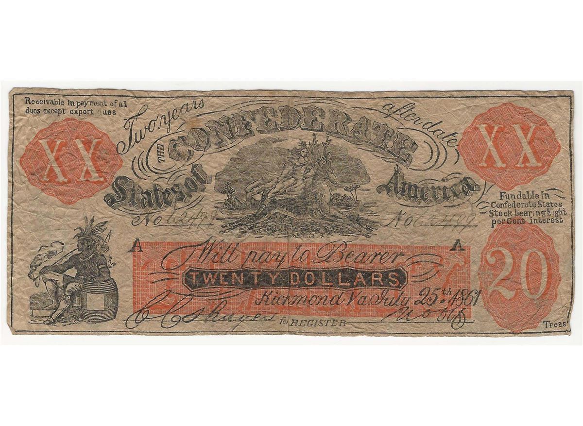 One July 25th, 1861 $20 Confederate States of America COUNTERFEIT Note.