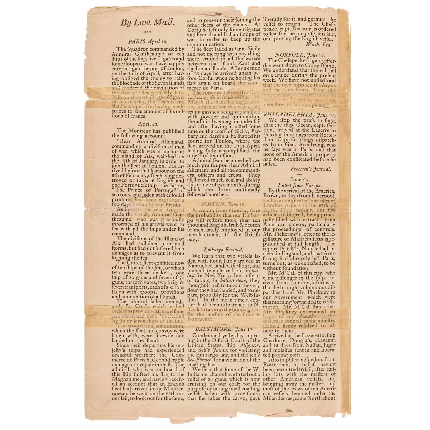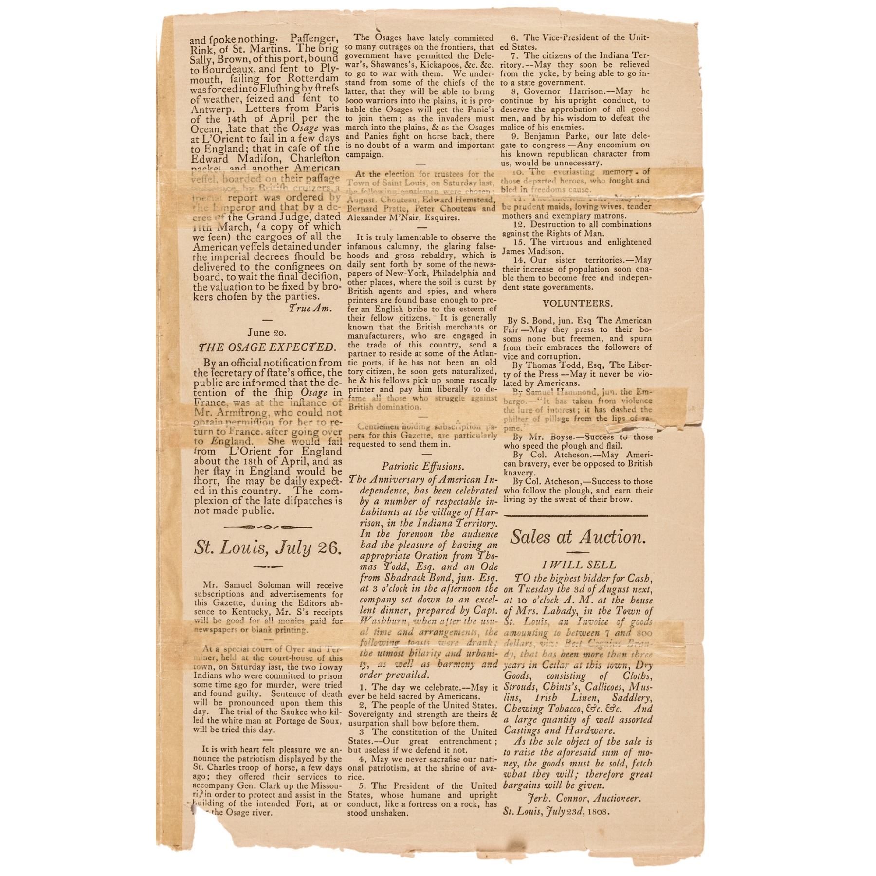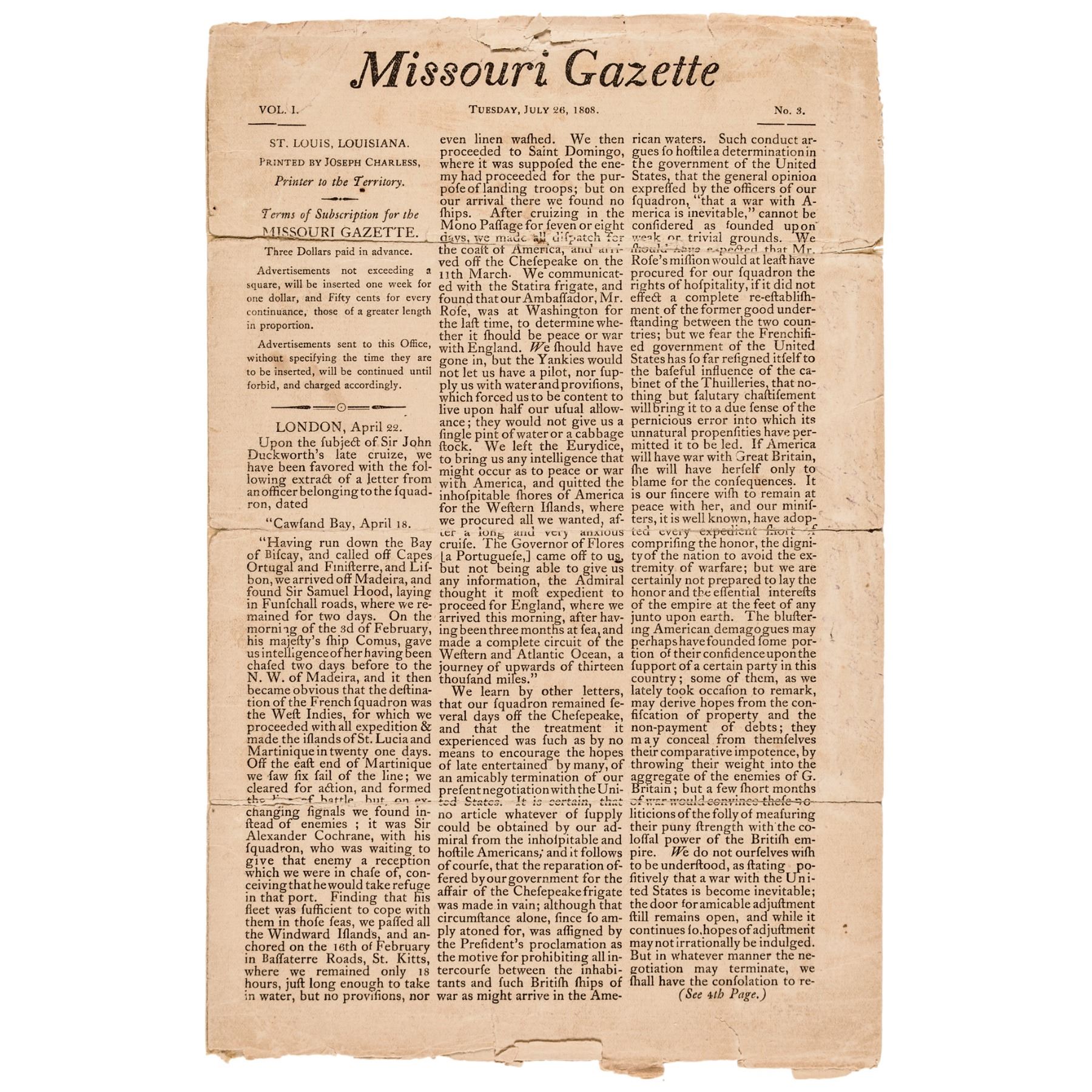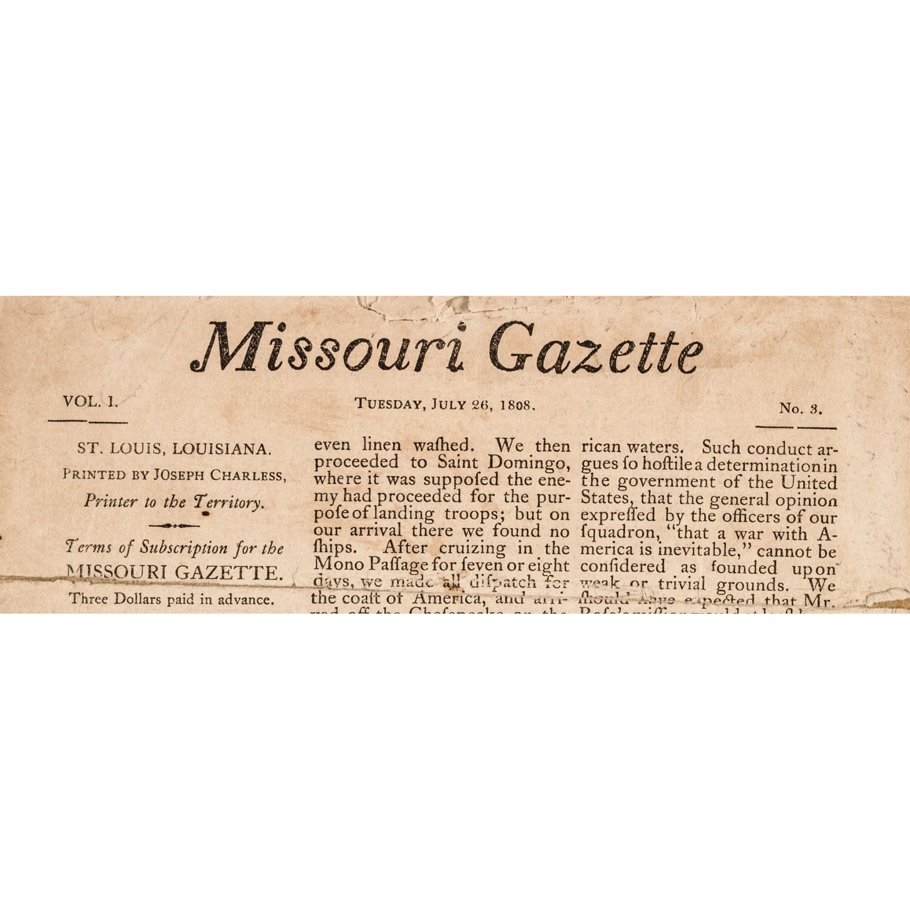 A rare original copy of Volume 1 Issue Number 3 Dated “Tuesday, July 26, 1808” which measures 7.5” x 11.75”, 4 pages. The first edition was printed July 12, 1808. No copy survives. Subscriptions were $3 per year. The paper identified Charless on the masthead as “Printer to the Territory”... “Printed by Joseph Charles, Printer to the Territory” St. Louis, Louisiana. There are fold splits, edge chips, as well as internal pages archivally backed for preservation and folds reinforced with old cellophane tape. According to a recent article written by Tim O’Neil of the St. Louis Post-Gazette, No original first edition Number 1 is known to exist, leaving us only close subsequent issues, such as this Number 3. Local news consisted largely of public notices, Auctions etc. This particular issue discusses a Patriotic Anniversary of American Independence celebrated by an “Oration from Thomas Todd, Esq. and an Ode from Shadrack Bond, jun. Esq.” Joseph Charles had the local newspaper market all to himself until 1815, when the “Western Journal” hit the streets. He sold the Gazette four years later. It was renamed the “Missouri Republic” and, in subsequent variations on that name, survived until 1919. A rare 1808 early look back into a colorful, historical past.