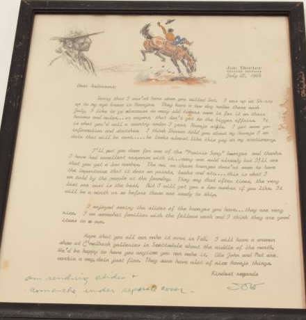 July 27, 1964 letter from Joe Beeler shows small vignettes of Navajo, bucking bronco in watercolor and talks to Andy about bronzes, Navajo rodeo and art show at camelback gallery. Est:$250-500