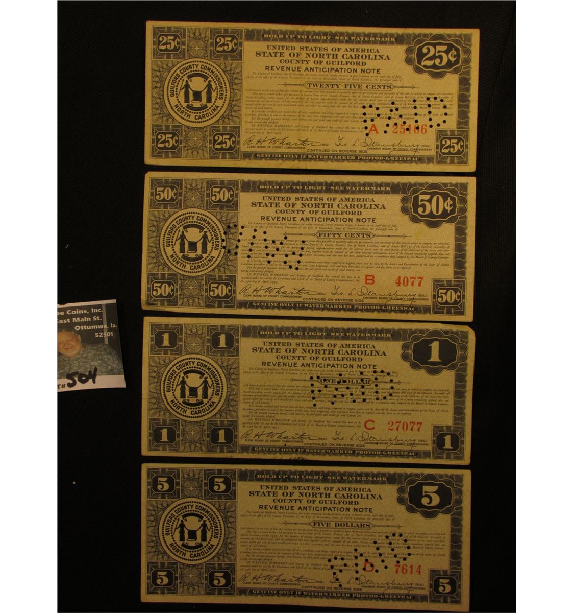 July 29, 1933 25c, 50c, $1, & $5 Depression Scrip "United States of America State of North Carolina County of Guilford Revenue Anticipation Note(s)". MS #: NC140-.25, .50, 1, & 5.