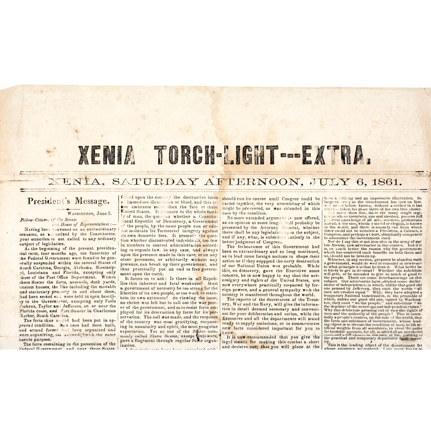 July 6, 1861, Newspaper Broadside “Extra” entitled, “Xenia Torch-Light”, Xenia, (OH), Very Good.