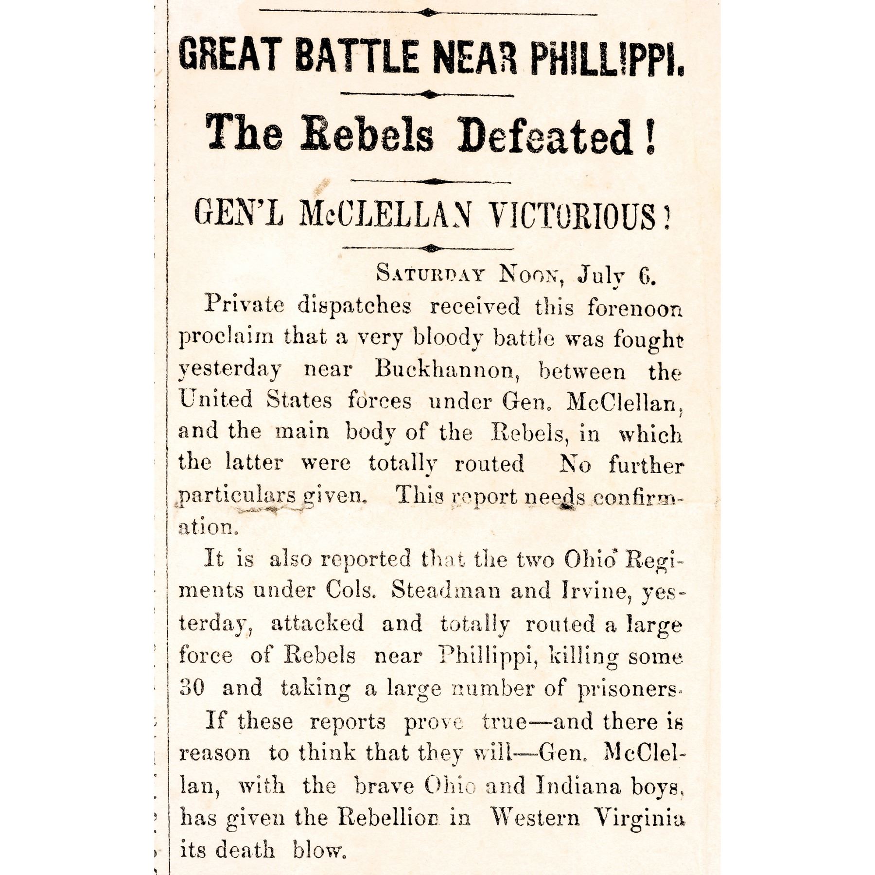 This is an original, Broadside, “Extra,” mneasuring 26” x 10.5” that was published on July 6, 1861 at Xenia, OH detailing the text of President Lincoln's June 5th Message to Congress. In this message, Lincoln goes over the events transpiring since the attack on Fort Sumter, and the commencement of hostilities. He gives a litany of aggressive acts to justify his use of constitutional war powers, including the unpopular suspension of the writ of habeas corpus. This Broadside “Extra” has one news item, the report of Gen. McClellan's victory at Phillippi in Western Virginia. Waterstained along right side, some loss on the right margin and scattered holes, affecting little text. An extremely rare Abraham Lincoln related item.