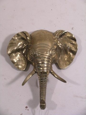 A miniature brass elephant head used as a background prop in the production of Jumanji (1995), starring Robin Williams. The film is about a fictional board game that, if played, can release all sorts of wild things, but can be tamed by finishing the game. This prop is painted gold, and has moderate wear from being on set. Behind the left ear, there is a faint engraving, reading: "#47878. Tristar." (Measures approx. 6" x 2.5" x 7")
