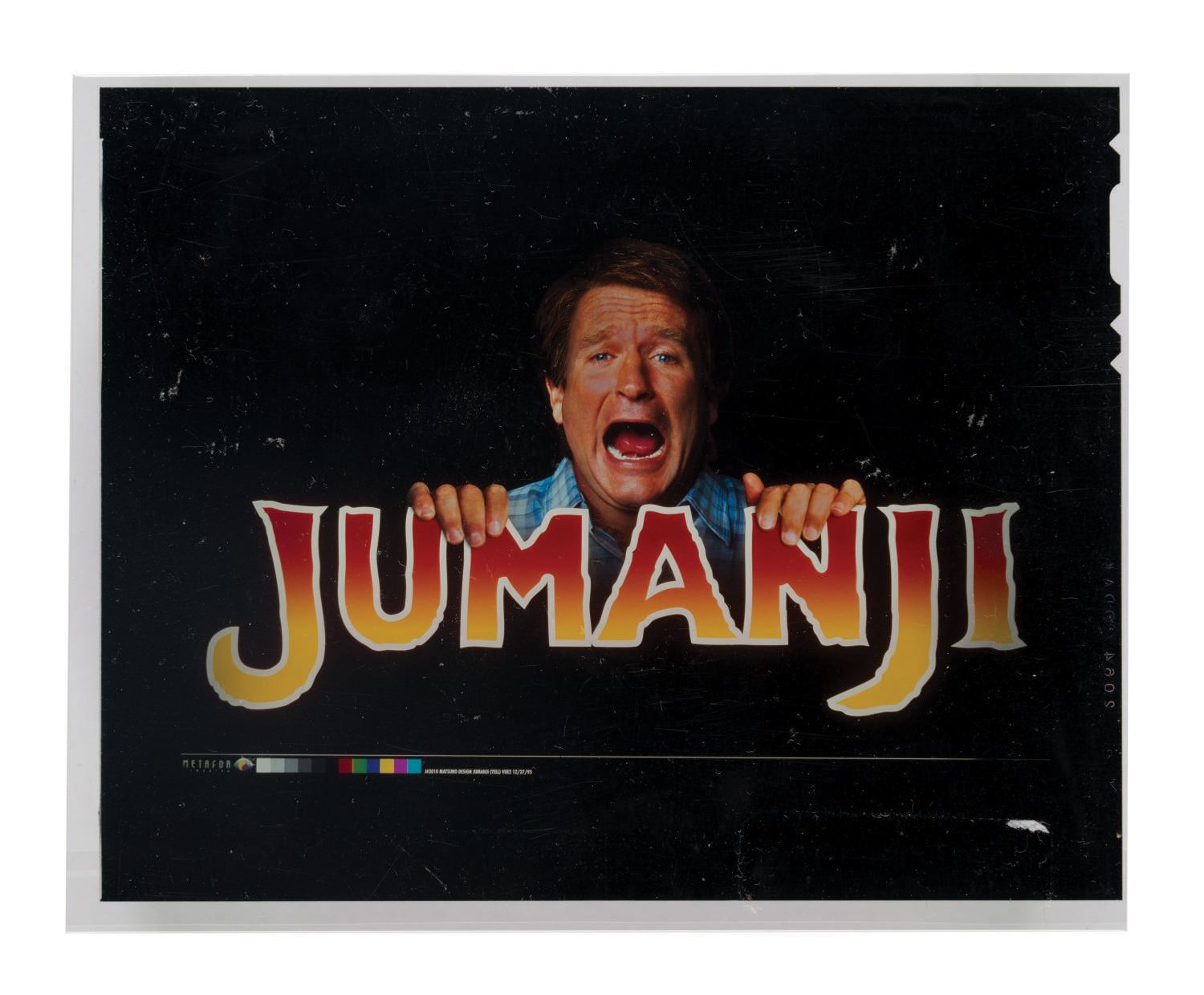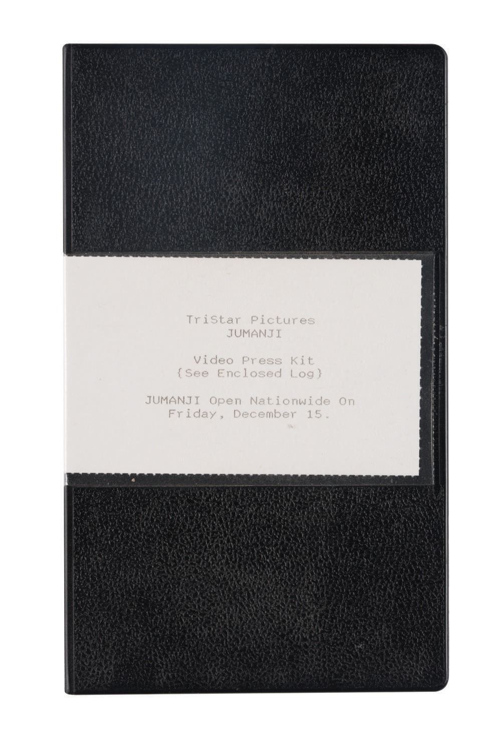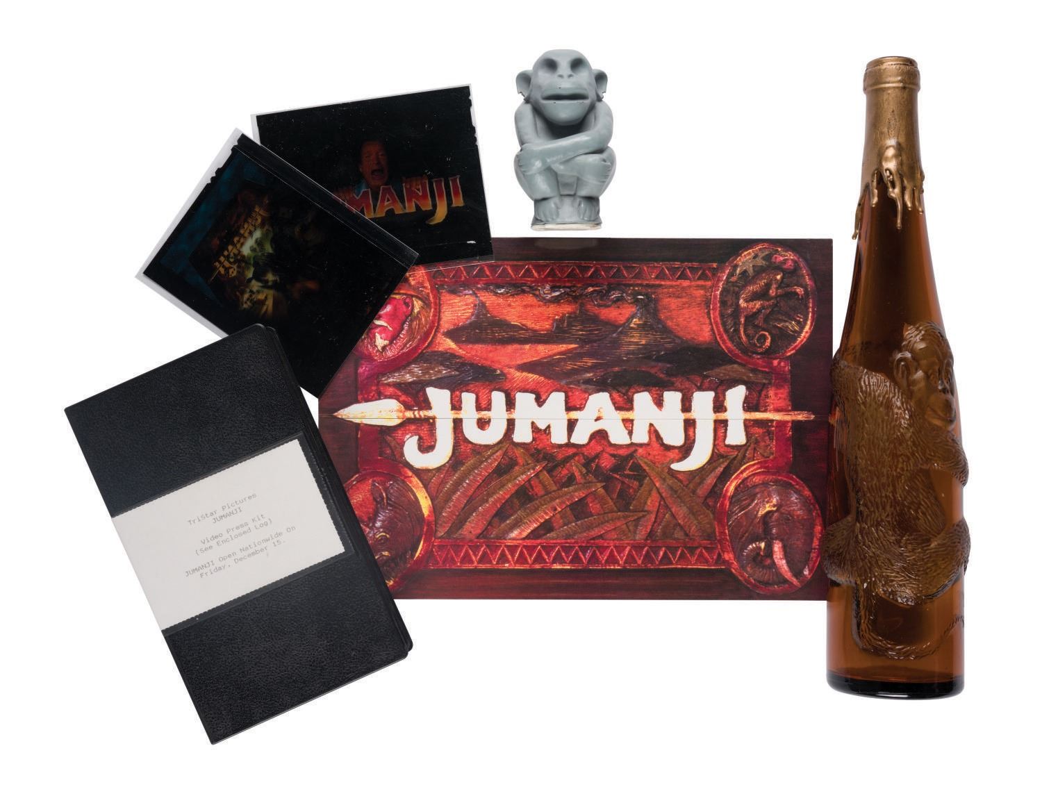 (Tri-Star, 1995) A press kit, wine bottle prop, and prototype game piece prop created for Jumanji. The press kit features a program, two promotional photo negatives, and a "video press kit." The collection also contains a resin prototype monkey game piece created for Chronicle Collectables and a prop wine bottle. Measuring various sizes, the press kit, prop wine bottle, and resin prototype prop are in fine overall condition. The monkey game piece prototype exhibits two chips (one on each ear).