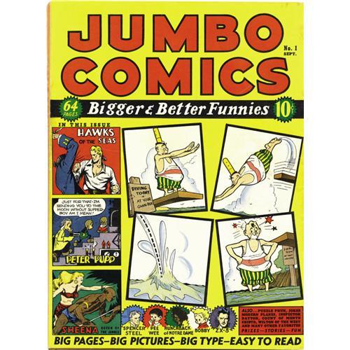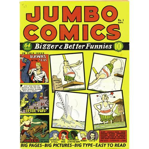 <B>Jumbo Comics #1 (Fiction House, 1938) Condition: VG/FN.</B></I> The first published comic book art by Jack Kirby is a milestone in any comic fan's book, and it came in this issue, which was also the very first comic published by Fiction House! The issue is on Overstreet's list of the 100 most valuable Golden Age comic books, it's called "rare" by Overstreet and is a Gerber "8." It also has the first appearance of the publisher's most prominent character, Sheena, Queen of the Jungle, drawn by ace artist Mort Meskin. There were many other big-name contributors as well, including Bob Kane, who drew the Peter Pupp gag feature. Kirby drew both the Count of Monte Cristo and Wilton of the West stories, both signed "Jack Curtiss" - this was before the artist, whose real name was Jacob Kurtzberg, had settled on the Kirby pseudonym. Some sources attribute the Diary of Dr. Hayward feature, signed by "Curt Davis," to Kirby as well! Another well-known name is Dick Briefer, who drew the Hunchback of Notre Dame. And we haven't even mentioned Will Eisner yet - he not only contributed art to this issue, he and partner Jerry Iger came up with the concept for the series, convincing Fiction House, a pulp magazine publisher until then, to try its hand at comics. The comic has a mix of features typical of the early Golden Age, with adventure and gag features supplemented by tidbits on movie stars like Fay Wray (and even Buddy Ebsen!), and sports stars like Honus Wagner and Helen Wills Moody. And guess what, Mickey Mouse even appears in one panel. If you've ever wondered how the long-running series got its name, here's your answer - it's quite literally jumbo, measuring 10.5" x 14.5". And another oddity is that it's printed on alternating red and green paper! This copy's centerfold is detached. Overstreet doesn't list a grade above VF for this issue, and indeed, the hard-to-store format makes h <BR><BR><B>Important notice:</B> Heritage usually auctions material at the rate of 200-250 lots per hour. On some occasions eBay Live bid software or the Internet may not be able to keep up with the pace of the auction. We recommend placing a realistic absentee bid now as insurance to avoid disappointment. Occasionally the auctioneer may eliminate or reject an eBay Live bid, and the auctioneer may also reopen a lot after the close of the eBay live bidding (usually because we missed an audience bid), and may reject your bid even if it shows you as the winning bidder. By bidding via eBay Live, you agree that Heritage may award the lot to another bidder at its sole discretion under the circumstances described above or any other reasonable circumstances. Since eBay bids are not shown to us until we open the lot on the floor, we treat those bids just like floor bids. In most cases the floor responds before the eBay bid is presented to us, due to Internet lag time, so for consistency we have made it a policy that floor bids are always considered first over tie eBay live bids. Also please note that all Heritage lots purchased through eBay Live carry a 22.5% Buyer's Premium. Please make sure you read the Terms and Conditions before you bid. This lot is being auctioned in conjunction with a live floor auction by Heritage Auction Galleries. All final auction and invoice information will be supplied by Heritage Auction Galleries, and all other information should be considered preliminary. Lot:41001 <BR><BR><B>Winning Notification and Billing:</B> After the FINAL session in this auction is complete, Heritage will send e-mail and snail mail invoices. This process normally takes several days. All final auction and invoice information will be supplied by Heritage Auction Galleries, and all other information should be considered preliminary. <BR><BR>This auction will be conducted on a live auction floor and over the Internet through eBay Live. If you choose to place an absentee bid, please take a moment to <font color='#0000ff'><u><a href='http://pages.ebay.com/liveauctions/help/before/laabsentee.html'>learn how eBay Live absentee bidding works</a></u></font><font color='#000000'>
