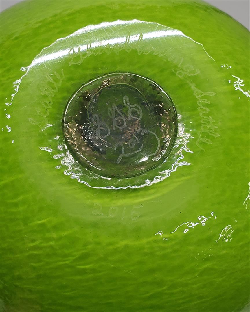 Green apple with golden stem, this piece measures 17" tall and 11" diameter.