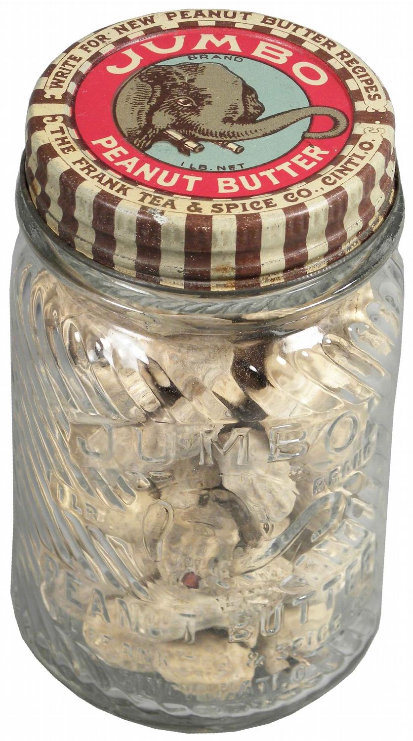 Jumbo Peanut Butter Embossed Glass Jar with tin litho lid. The Frank Tea & Spice Co. Cincinnati, O. No chips or cracks, tin lid in excellent condition.