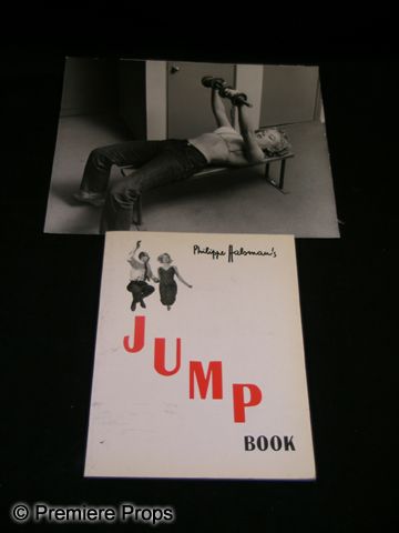 Originally printed in 1959 and re-issued in 1986, a copy of Philippe Halsman's large size paperback book titled 'Jump.' This interesting book captures many celebrities, athletes and famous persons of the day simply jumping in the air to be photographed. Also comes with a wonderful black and white photo of Marilyn Monroe as she lifts barbells in blue jeans and a bikini top. (book measures 8 3/4"x 11" and photo measures approx. 11" x 14")