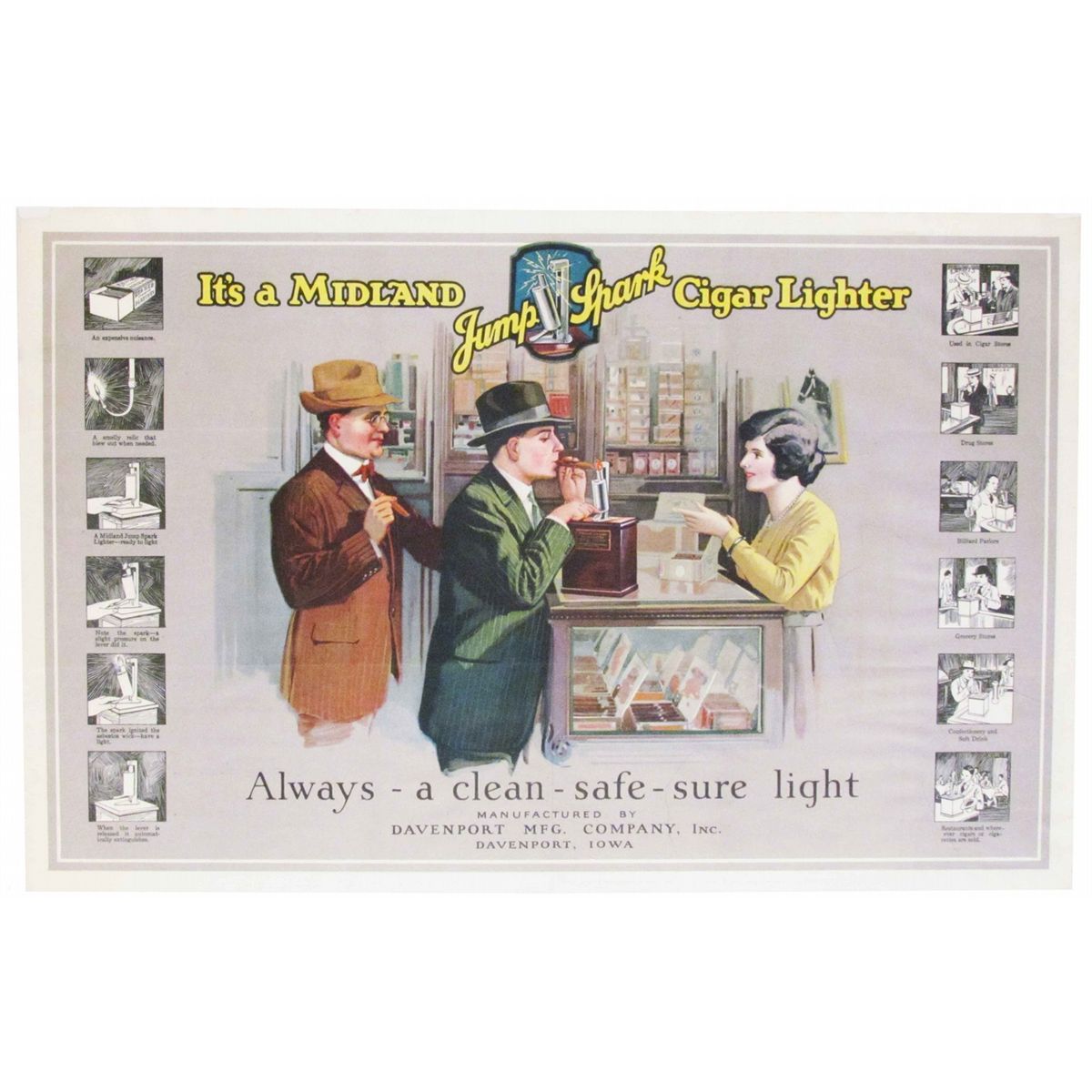 Jump Spark Lighter Two Sided Paper Sign. Detailed pictorial for use of lighter on front and models available on back. Some fold creases otherwise excellent condition. 17 X 11 inches.