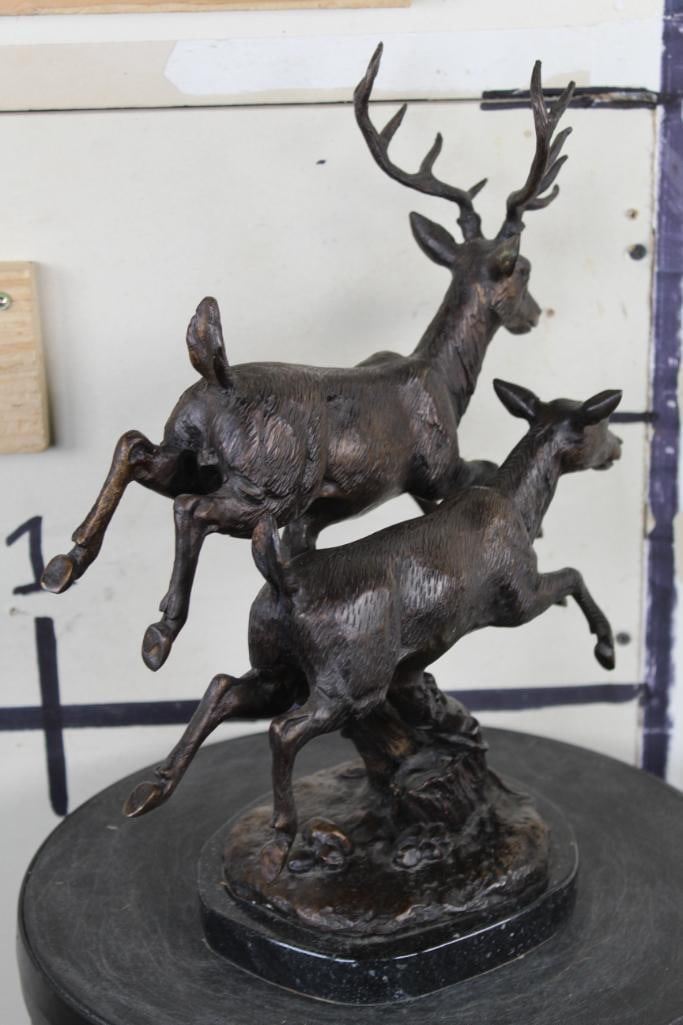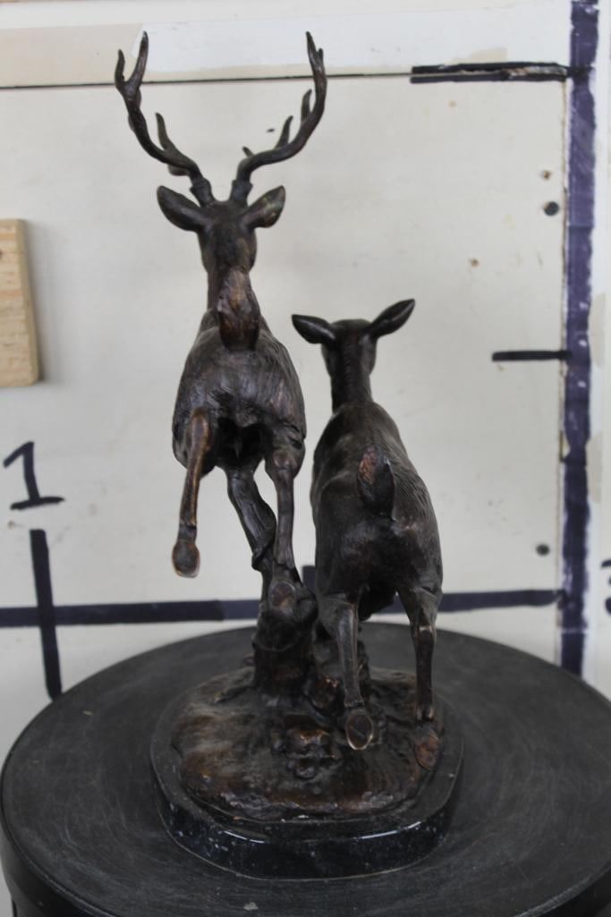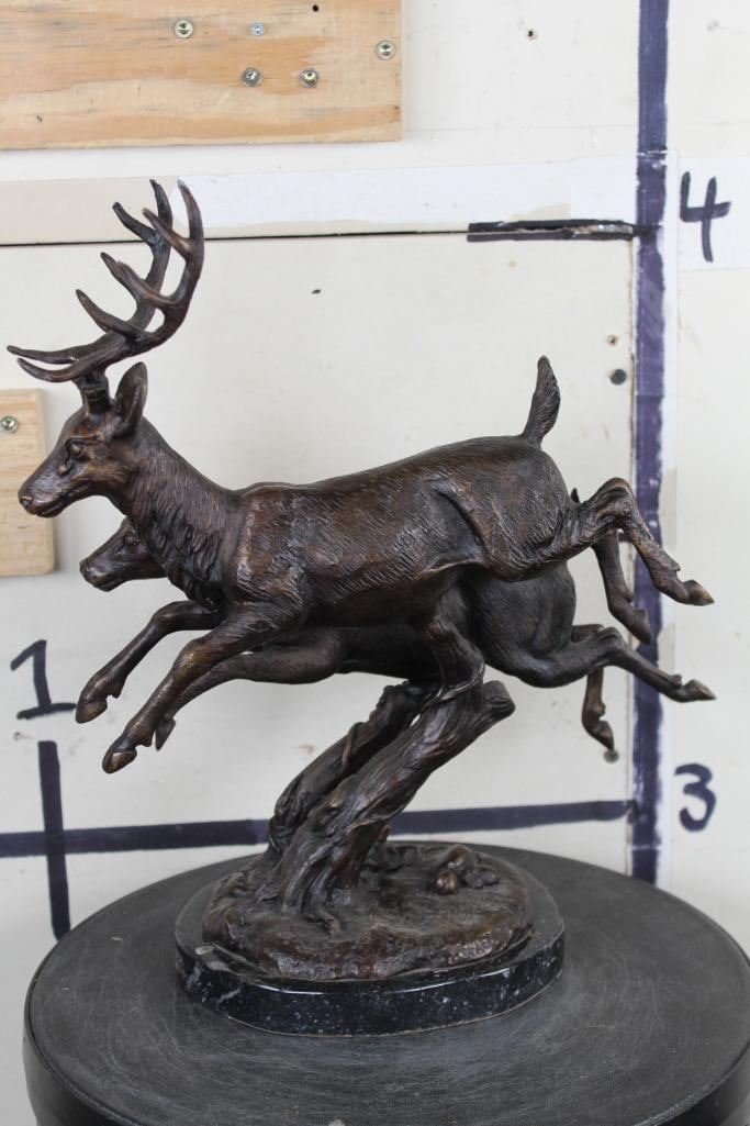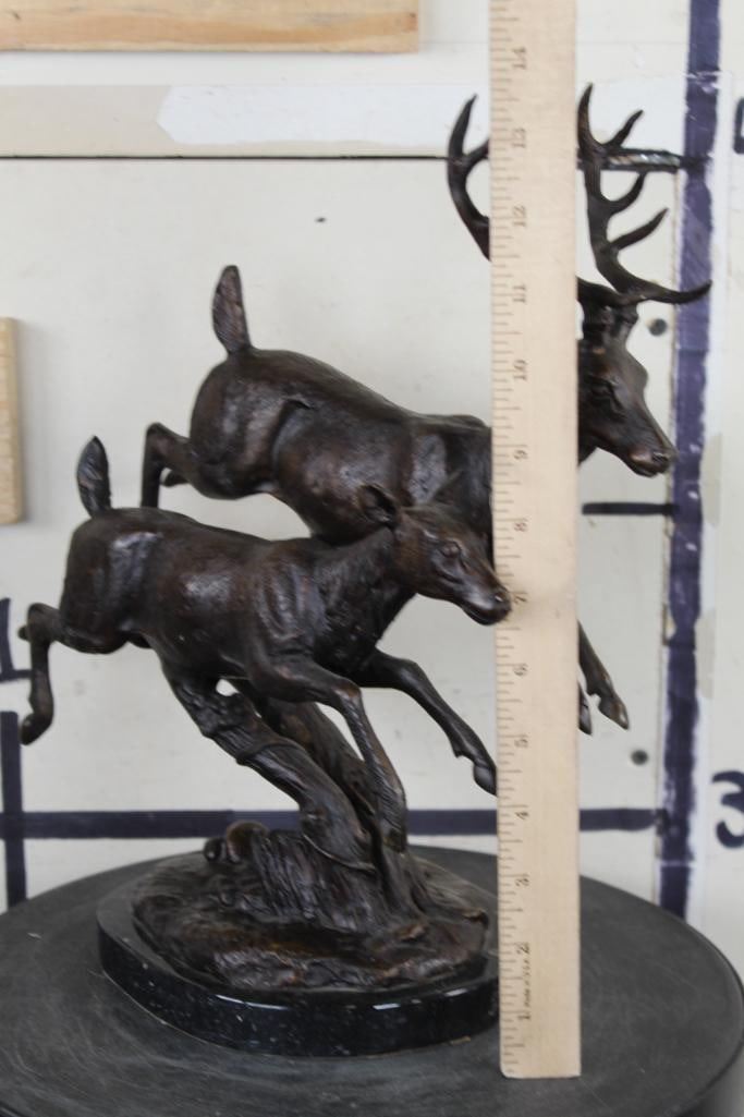 Jumping Deer and Doe BRONZE Cast Sculpture. The Total Weight is 8lb 5oz and it is on a MARBLE Base. It measures 13.5" Tall x 6" Wide x 12" Long. COLLECTIBLE ART BRONZE SCULPTURES