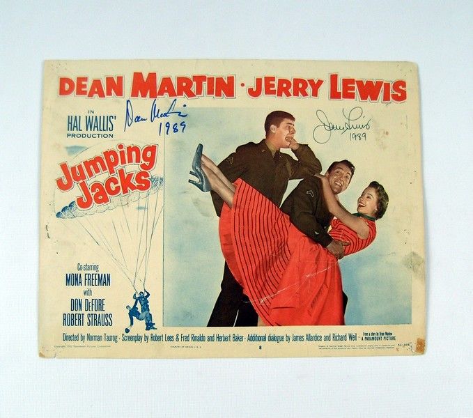 Considered one of the most successful comedy teams of all time, Dean Martin and Jerry Lewis had a ten year run that had them traveling the country, doing nightclubs, stadiums, concert halls, TV and especially a series of movies. No group until the Beatles invaded the US in the early sixties caused such literal riots of fans wherever they went. "Jumping Jacks" (1952) is one of their feature comedies produced right smack in the middle of their huge popularity. This is a rare original theatrical Lobby Card. It has been personally signed by both Dean Martin and Jerry Lewis for inclusion in the Songwriters Hall Of Fame Museum. Lobby Card shows signs of wear, has corner pin marks and one staple, and has had a lower right hand corner tear repaired. 14"x11".