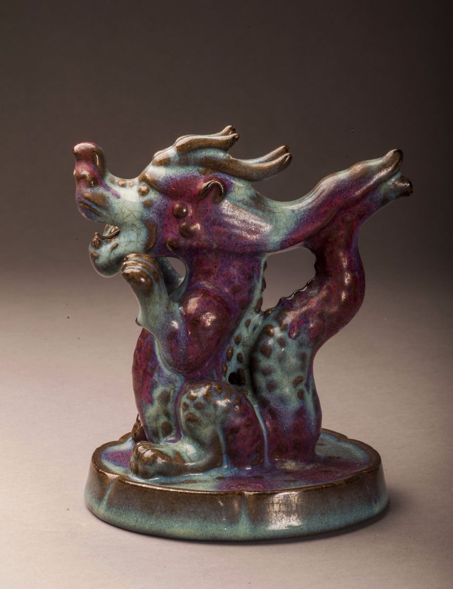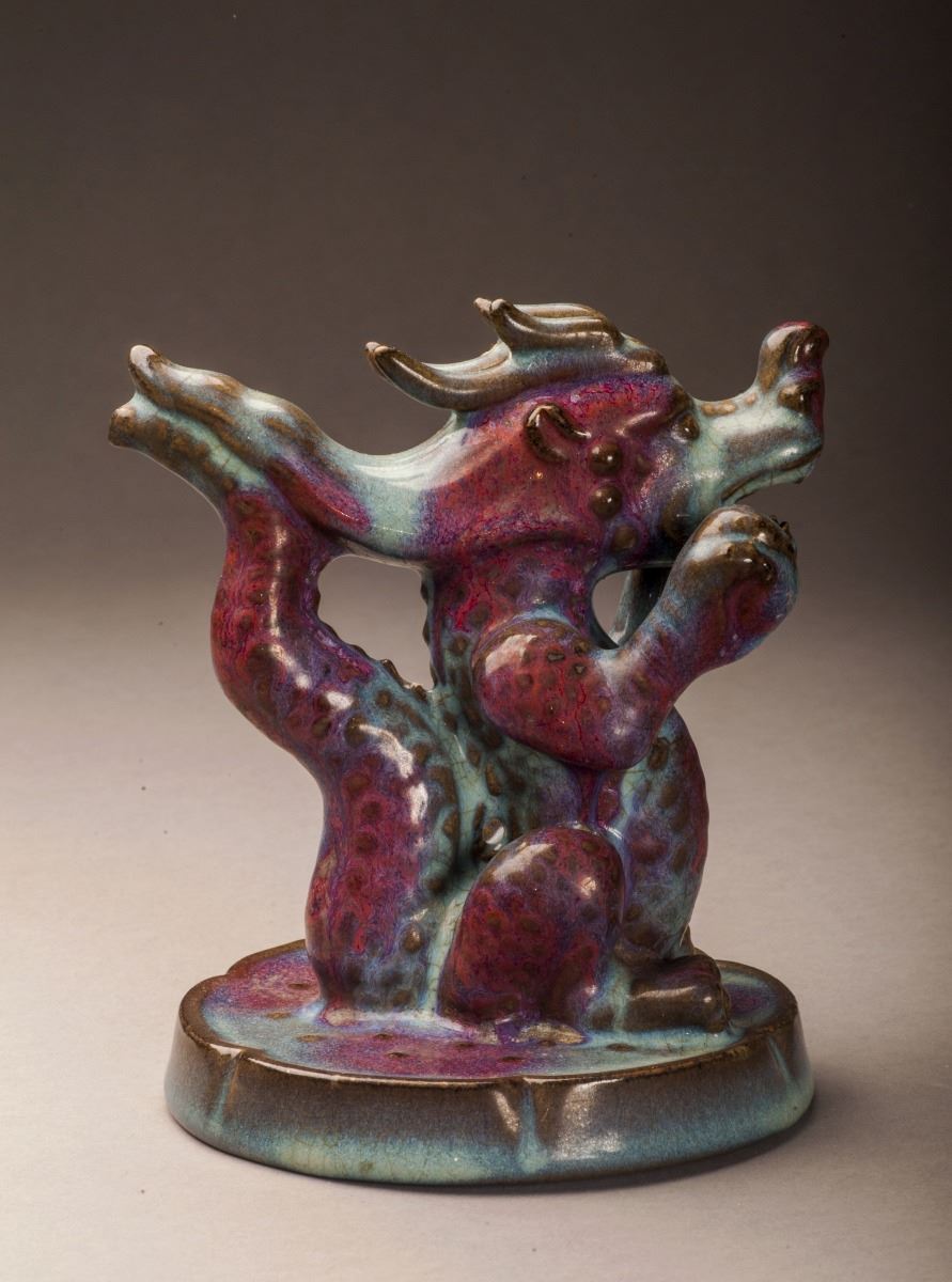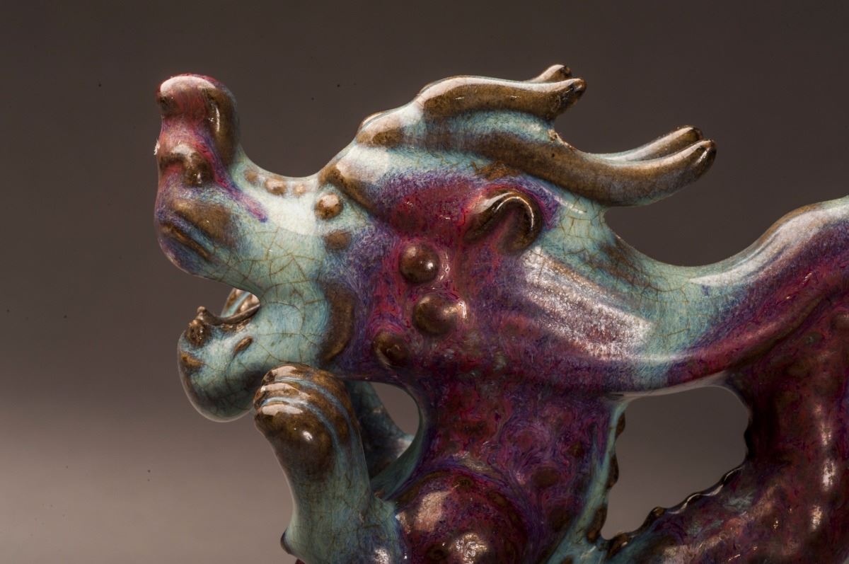 With Fine Jun-ware Glaze Throughout, Within The Alternative Blue And Fading Purple Tone. Vividly Expressed With A Statue Of Dragon. With Its Tail Extending To The Head. Face Vividly Expressed.