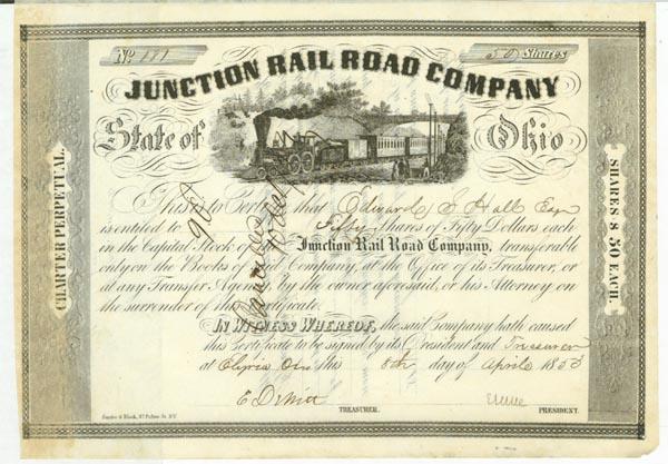 1853, Ohio. Stock certificate for 50 shares. Top center vignette of train. Litho. Uncancelled and Extremely Fine.