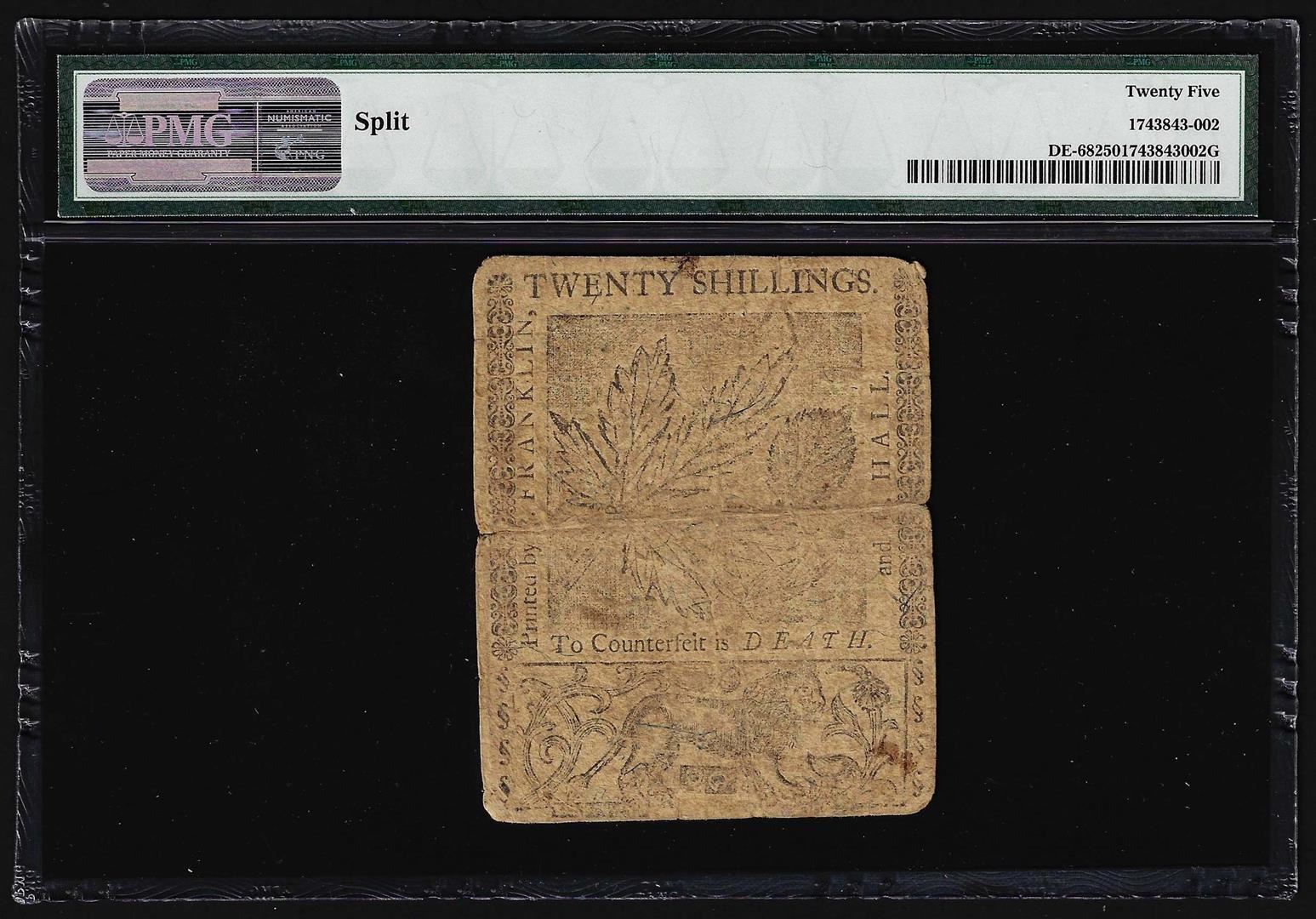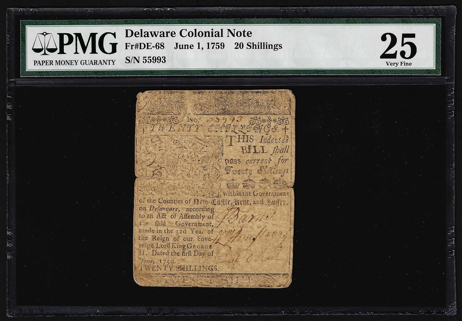 One June 1, 1759 Delaware 20 Shillings Ben Franklin Colonial Note PMG Very Fine 25. PMG Certified.