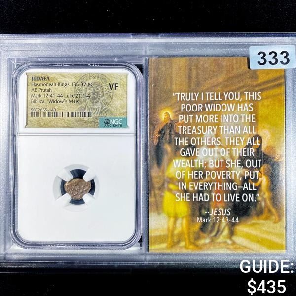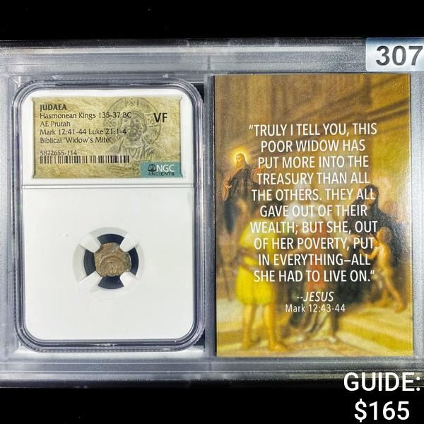 135-37 BC Judaea AE Prutah 'Widow's Mite' NGC - VF