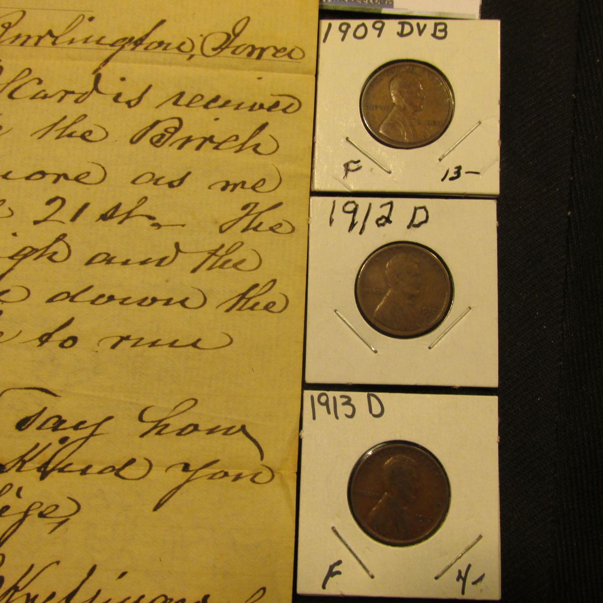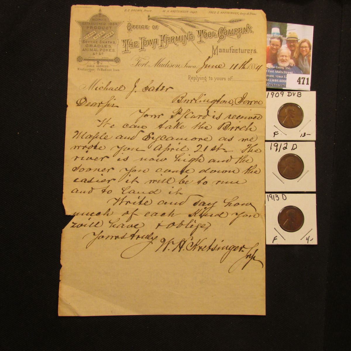 June 11, 1884 "Office of The Iowa Farming Tool Company Manufacturers Fort Madison, Iowa Works Established 1854 Product Forks Hoes Rakes Scythe Snaths Cradles, Animal Pokes & c. & c.", discusses purchasing Birch, Maple, and Sycamore Timber; & 1909 P VDB, 12 D, & 13 D Liincoln Cents, VG-F.