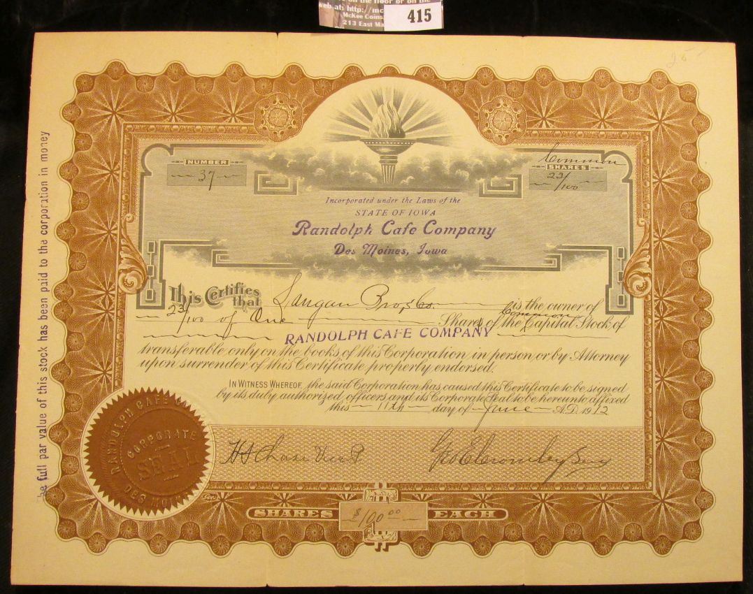 June 11th, 1912 Number 37 Common Shares 23/100 "…State of Iowa Randolph Café Company Des Moines, Iow