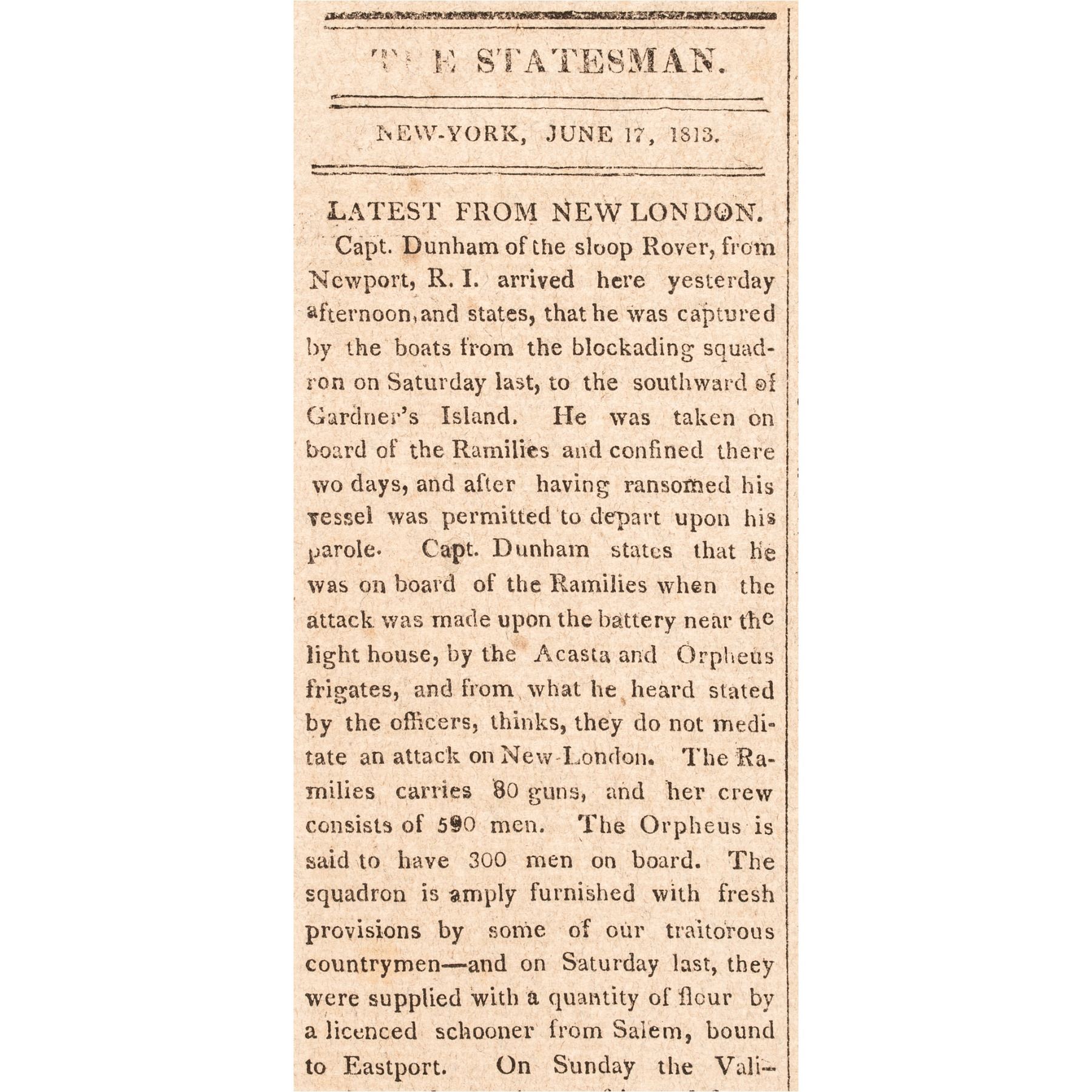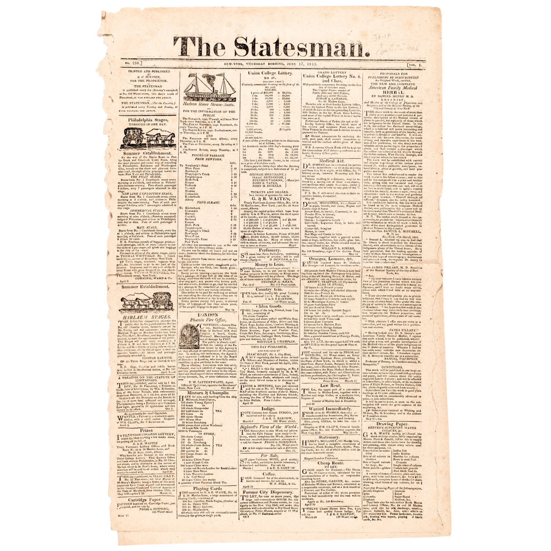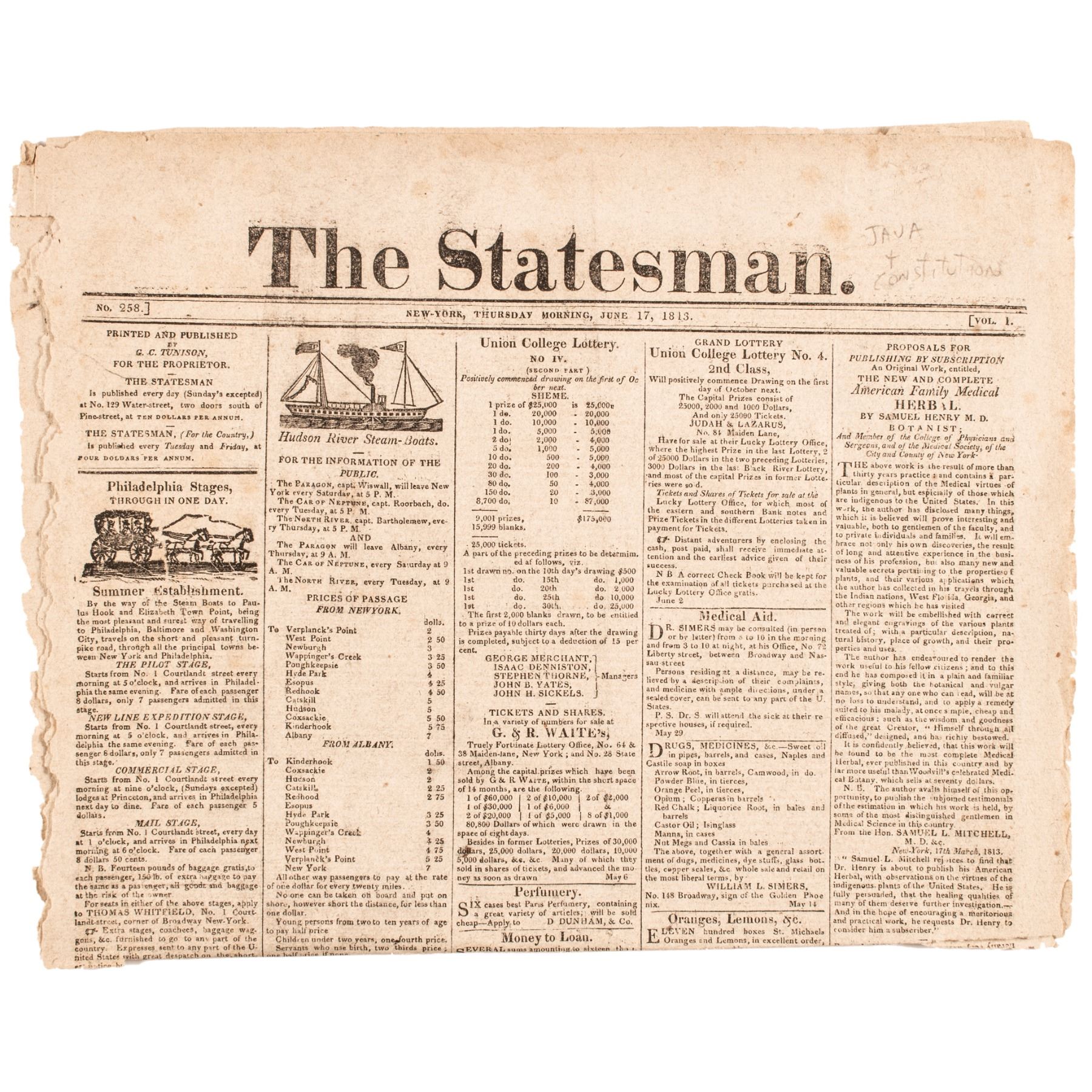 June 17, 1813-Dated War of 1812, Newspaper titled, “The Statesman”, New York, reporting the Naval Battle between the USS Constitution and HMS Java, action taking place on December 30, 1812, Choice Very Fine.