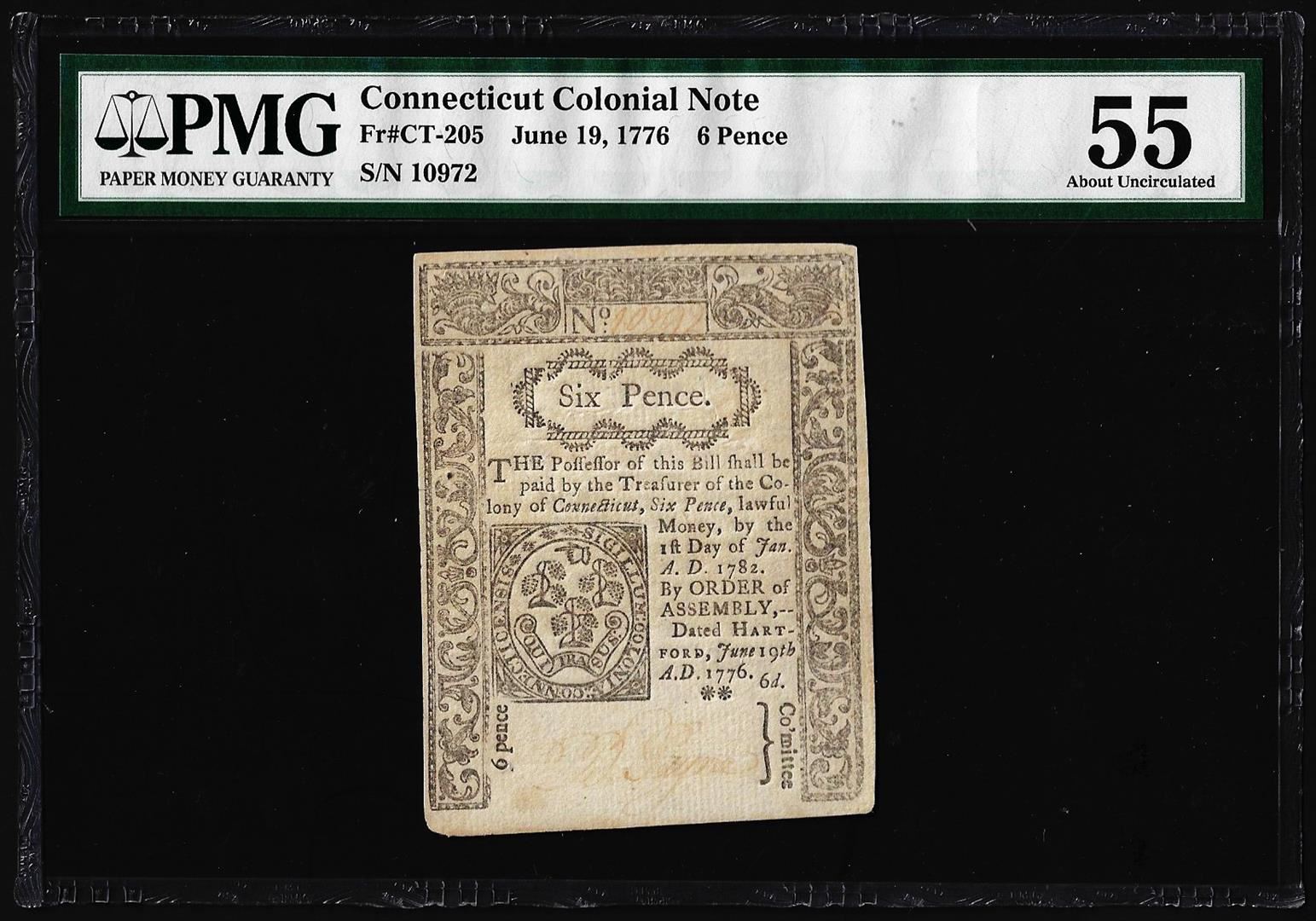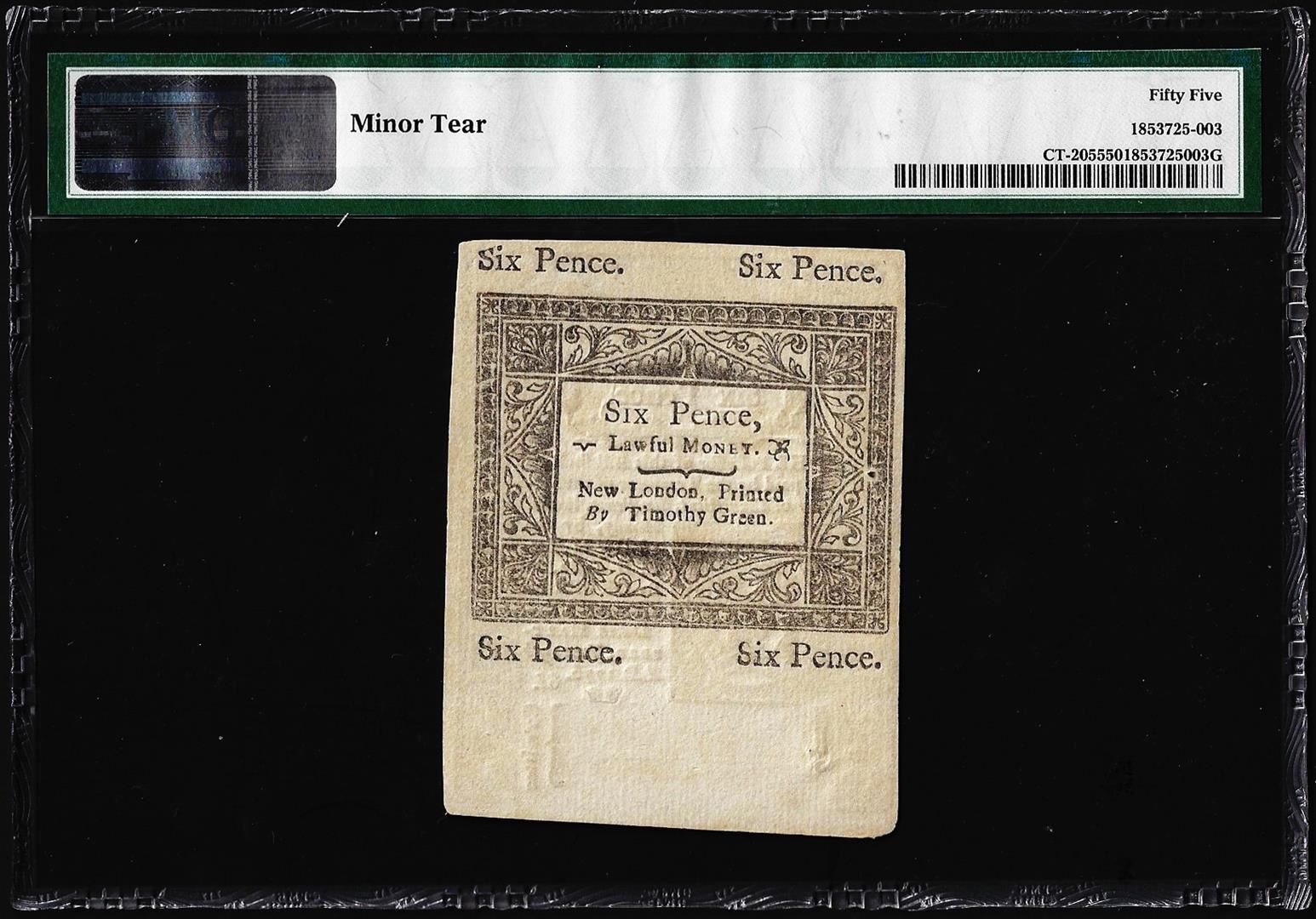 One June 19, 1776 Connecticut 6 Pence Colonial Currency Note PMG About Uncirculated 55. PMG Certified.