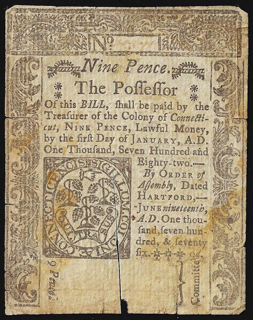 One June 19, 1776 Connecticut Nine Pence Colonial Currency Note. Only 15,000 of this denomination were issued.