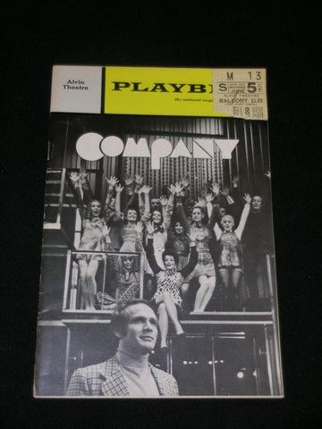 From June 1971, this is an issue of the theatrical periodical Playbill featuring an in depth review and article on the play 'Company.' There is a ticket stub stapled to the upper right corner of the cover, but the issue is in very nice condition. (measures approx. 6" x 9")