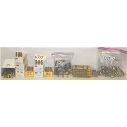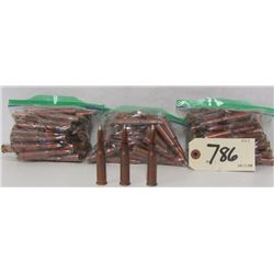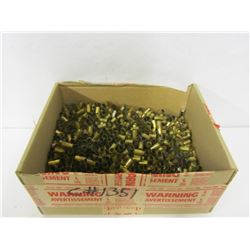INCLUDES: 2 BOXES WORTH OF 243 WIN BRASS, 4 BOXES WORTH OF 338 WIN MAG BRASS, 1 BOX OF 357 MAG BRASS AND A BAG OF ASSORTED PISTOL CALIBER BRASS.