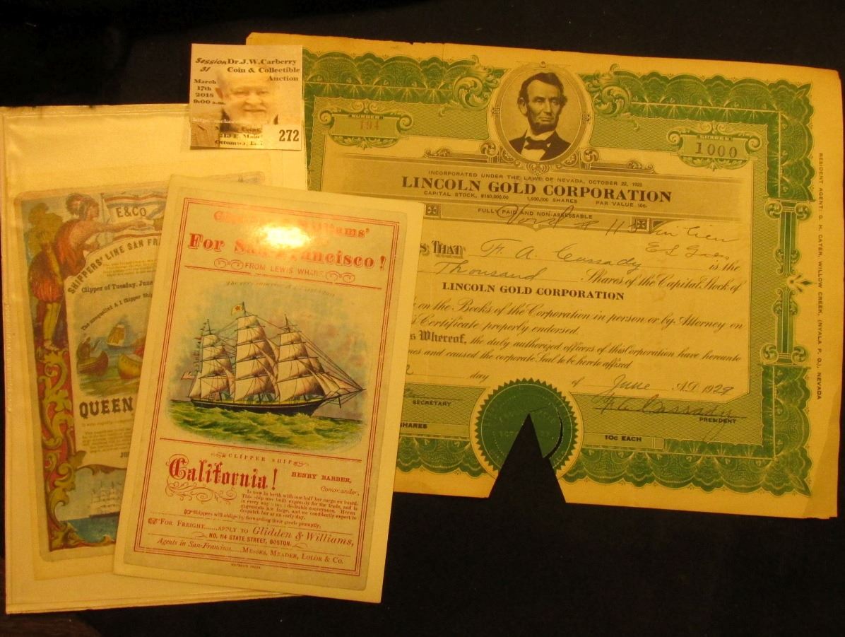 June 22, 1929 1000 Shares Stock Certificate for "Lincoln Gold Corporation", Nevada, cut-cancel through notary seal; & (2) different Clipper Ship flyers (very colorful).