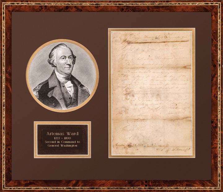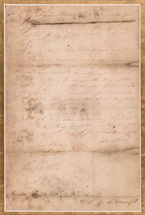 A remarkable Revolutionary War seige of Boston Document written less than one month before the Declaration of Independence was signed which transformed thirteen "United Colonies" into the United States, this Manuscript Document is Signed, "Artemas Ward" in brown ink, as General at the Headquarters in Boston, one page, measuring 12" x 8" (by sight), professionally archivally matted and framed under Plexiglas to an overall size of 18.5" x 21.5". This fabulous historical pay order is addressed to Deputy Paymaster General Ebenezer Hancock "of the Army of the United Colonies". There are six units of the Army National Guard (101st Eng Bn, 125th MP Co, 181st Inf, 182nd Inf, 197th FA, and 201st FA) derived from these American units that participated in the Siege of Boston. There are thirty currently existing units in the U.S. Army with lineages that go back to the Colonial era. This Document reads, in part: