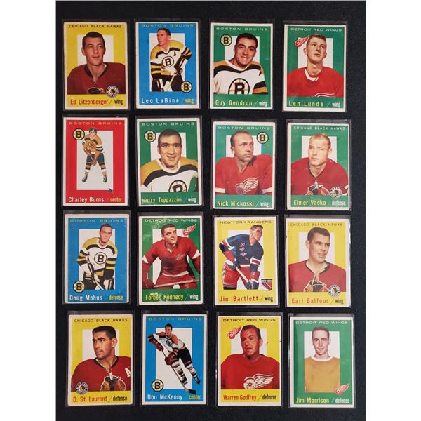 16 different commons from the 1959-60 Topps hockey issue, including: #3 Valo (GD), #7 Labine (VG), #9 McKenney (VG/EX), #22 Lunde (VG/EX), #24 Gendron