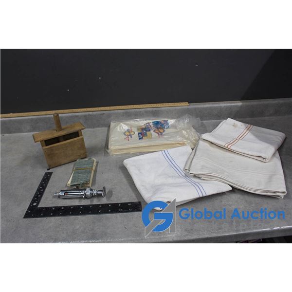 Vintage Dairy & Farm Items - 1lbs Co-op Butter Wrappers, Flour Sacks, Wooden Butter Press, etc