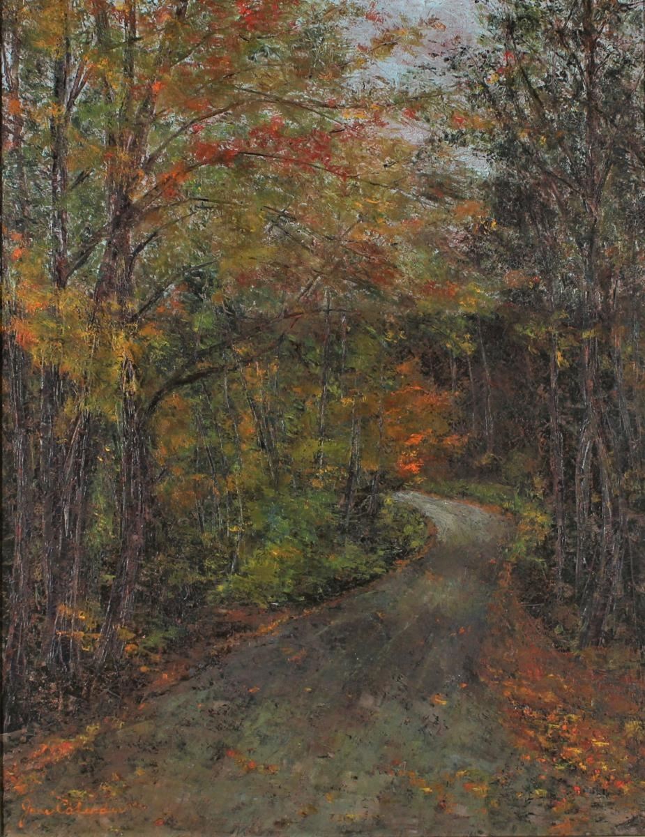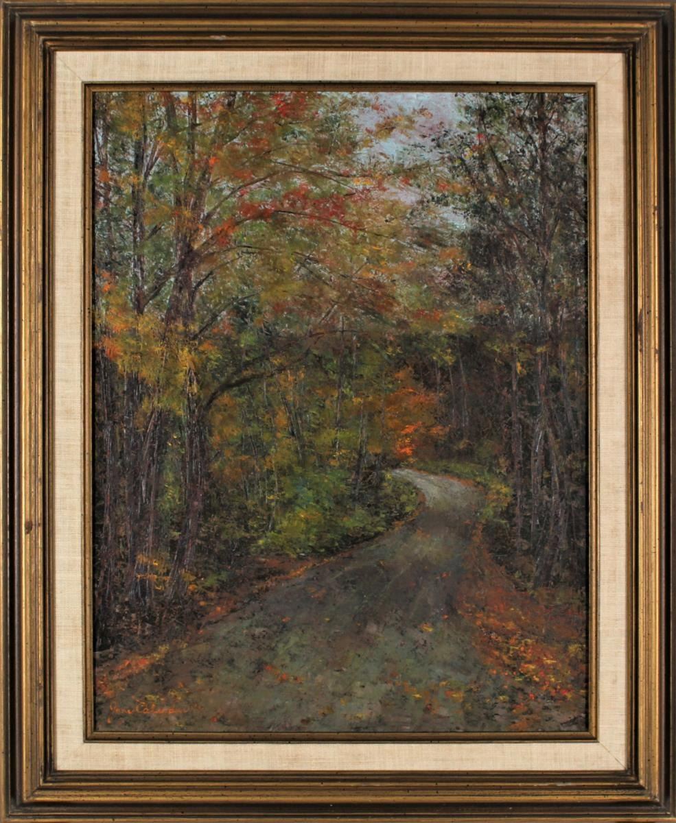 Titled "New Hampshire Highway", beautiful autumnal scene, signed lower left, oil on canvas.