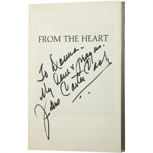 <B>June Carter Cash: Signed and Inscribed</B></I><B><I> From the Heart</B></I></B></I> (New York: Prentice Hall Press, 1987), first edition, 197 pages, illustrated, gray binding with red-cloth spine and silver lettering, 8vo (8.5” x 5.5”), dust jacket. What else would June Carter Cash’s autobiography be titled? (She initially wanted to call it “Out of My Mind.”) In this no-nonsense account, the musician, singer-songwriter, wife of the legendary Johnny Cash, and woman of deep faith covers the highs and lows of her life and career. The half-title page is boldly inscribed <I>“To Donna. My love and prayers. June Carter Cash.”</B></I> The book is in fine condition with minor dings; the dust jacket is in very good condition with some creases and minor wear.<BR><BR><b>Shipping:</b> Books & Catalogs (<a target="_blank" href="http://www.heritageauctions.com/common/shipping.php">view shipping information</a>)