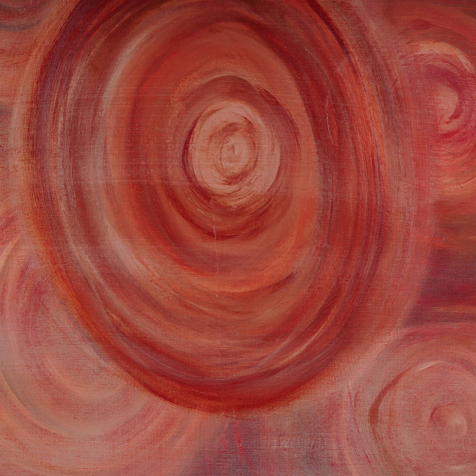 June Cashwell presents a mesmerizing abstract oil on canvas, titled Linen Circles. Bold concentric forms ripple outward in warm hues of red, terracotta, and burnt sienna, evoking both rhythm and movement. The composition draws the eye into its central vortex, while surrounding circular gestures create a sense of harmony and flow. This piece embodies both meditative calm and energetic resonance, making it a striking centerpiece for any collection. Signed lower right and titled with artist inscription on verso.