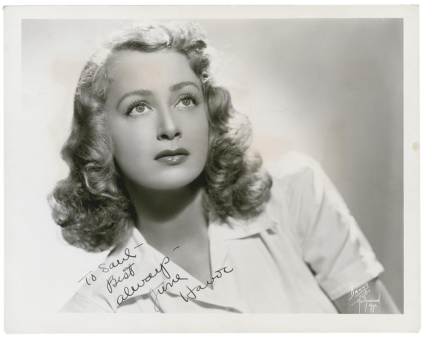 Vintage glossy 10 x 8 Bruno photo, signed and inscribed in-person in fountain pen “To Saul—Best always, June Havoc.” Reverse of photo bears collector’s stamp date of June 22, 1942, the date the signature was acquired. Reverse also bears an affixed caption noting that Havoc is hosting a Monte Carlo Bazarr to raise “contributions for the relief of Greece.” A few light surface impressions, silvering to darker areas of image, and scattered toning from adhesive on reverse, otherwise fine condition. The Saul Goodman collection.