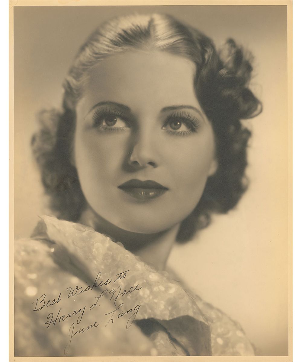 Oversized vintage matte-finish 11 x 14 head-and-shoulders photo, signed and inscribed in fountain pen, “Best wishes to Harry L. Nace, June Lang.” In fine condition, with a couple corner tip creases, and a few traces of light silvering.