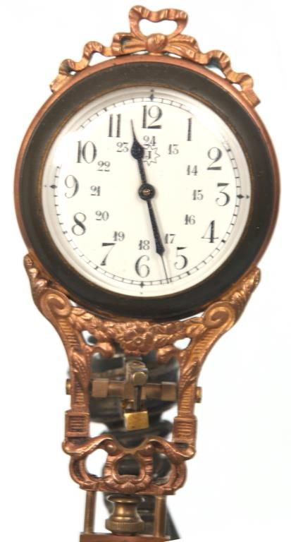 Junghans Statue of Liberty Swinger Clock. Standing cast figure of the Statue of Liberty, the pendulum rests on 2 pins on a pivot pointing forward from the torch; the gridiron pendulum has gilt brass ribbon and filigree decorations, 1.75 in. dial with Arabic hour numerals, blued spade hands, brass spring driven movement is contained in the pendulum;. Signed with Junghans logo and numbered “7” on the movement. In good running condition, pendulum is 9.5 in. long, overall height is 18.25 in. high.