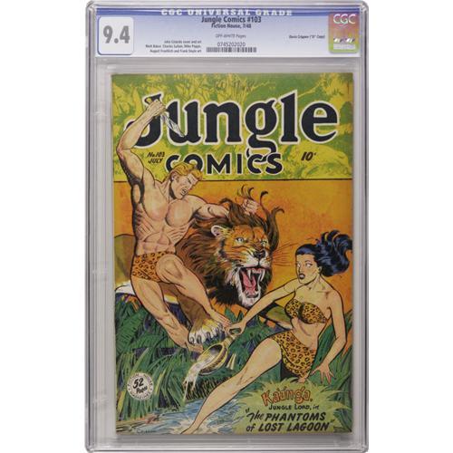 <B>Jungle Comics #103 Davis Crippen ("D" Copy) pedigree (Fiction House, 1948) CGC NM 9.4 Off-white pages.</B></I> John Celardo is the cover artist here, and you shouldn't be surprised when we say the cover features Kaanga, since the Jungle Lord appeared on exactly 100% of the covers in the 163-issue run! Meanwhile, the Camilla feature has Matt Baker art. Overstreet 2006 NM- 9.2 value = $220. CGC census 9/06: 2 in 9.4, none higher. <I>From the Crippen Collection</B></I>.<BR><BR><b>Shipping:</b> Slabbed Comic (<a target="_blank" href="http://www.heritageauctions.com/common/shipping.php">view shipping information</a>)
