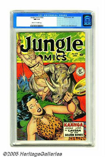 <B>Jungle Comics #109 (Fiction House, 1949) CGC NM 9.4 Off-white to white pages.</B></I> When Ann Mason's in trouble, her husband Kaanga is there on the double! The cover scene is by John Celardo; the issue's interior artists include the highly collectable Matt Baker. Fiction House fans take note, this is not only the highest-graded copy CGC has certified as of this writing, it's the only one graded above 8.5. Overstreet 2005 NM- 9.2 value = $210. CGC census 3/05: 1 in 9.4, none higher.